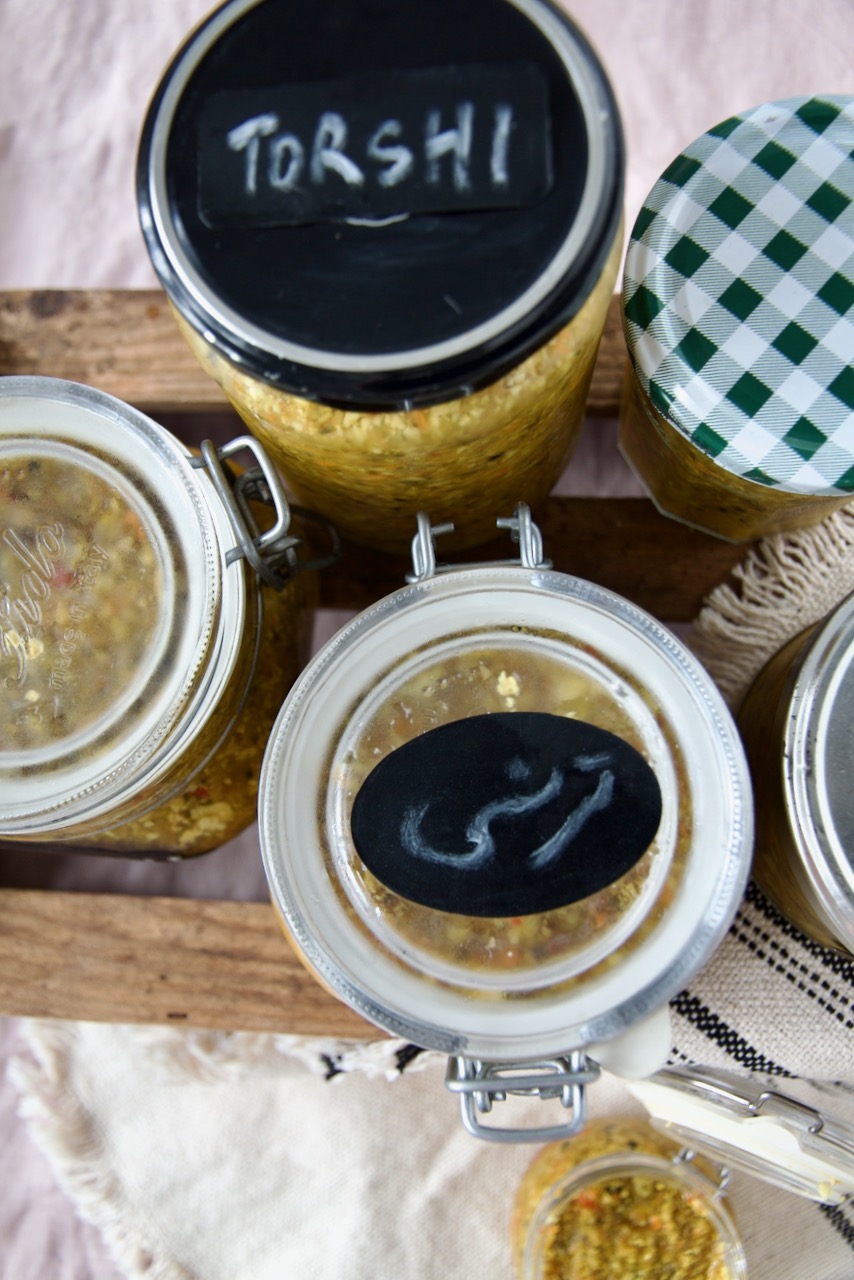 Torshi oder auch Torshi Makhloot (gemischt) genannt, ist ein in Essig-Salz-Lake eingelegtes Gemüse. Zu den typischen Zutaten gehören Weißkohl, Blumenkohl, grüne Bohnen, Möhren, Auberginen, Paprika, Pfefferonen, grüne Tomaten, Topinambur, Ingwer, Gurken, Kürbis und vieles mehr. Die Zubereitung ist wirklich sehr einfach und schnell, aber du musst Geduld haben, denn frühestens nach 4 Wochen, aber besser noch nach einem Jahr kannst du Torshi Liteh erst geniessen.