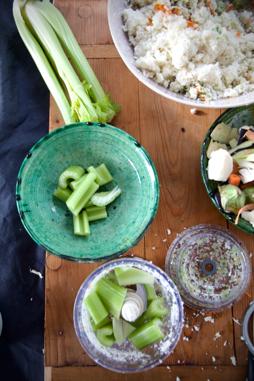 Weißkohl, Gurken und Staudensellerie in grobe Stücke schneiden und ebenfalls fein hacken. In die Schale geben.