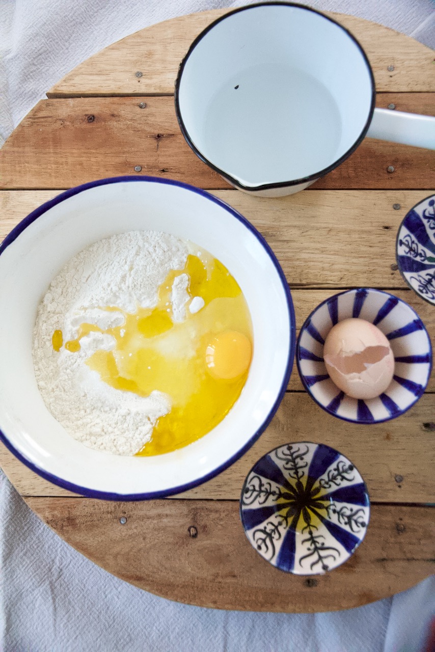 If you want to prepare both versions, just double the amount of ingredients for the dough. Mix flour with salt, sugar, lukewarm water, egg and oil well to a dough and knead until it is soft and elastic.