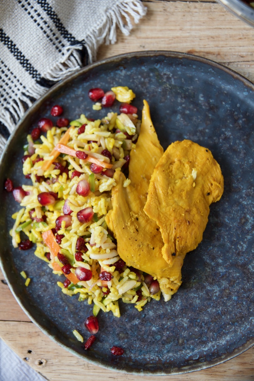 Wenn es draußen warm ist und du lieber etwas frisches essen möchtest, ist mein veganer Juwelen-Reis-Salat perfekt. Der Reis-Salat ist allein schon sehr sättigend und nahrhaft, passt aber auch wunderbar als Beilage zu veganen Gerichten, z. B. Gemüse Grillspieße, vegane Frikadellen aus rote Linsen, breite grüne Bohnen mit Tomaten, Auberginen-Türmchen oder Auberginen mit Schwarzaugenbohnen in Tamarinden-Sauce. Passt aber auch genauso gut zum Geflügel, Fleisch und Fisch, z. B. Huhn, Brathuhn, gegrillter Kabab oder Doradenfilet. Ich bereite meist etwas mehr Reis zu, damit ich für den nächsten Tag einen köstlichen Reis-Salat zubereiten kann. Du kannst aber auch das Rezept mit dem fertigen Parboiled Basmati-Reis zubereiten. Hier habe ich noch ein weiteres veganes Reis-Salat Rezept mit Kurkuma für dich.