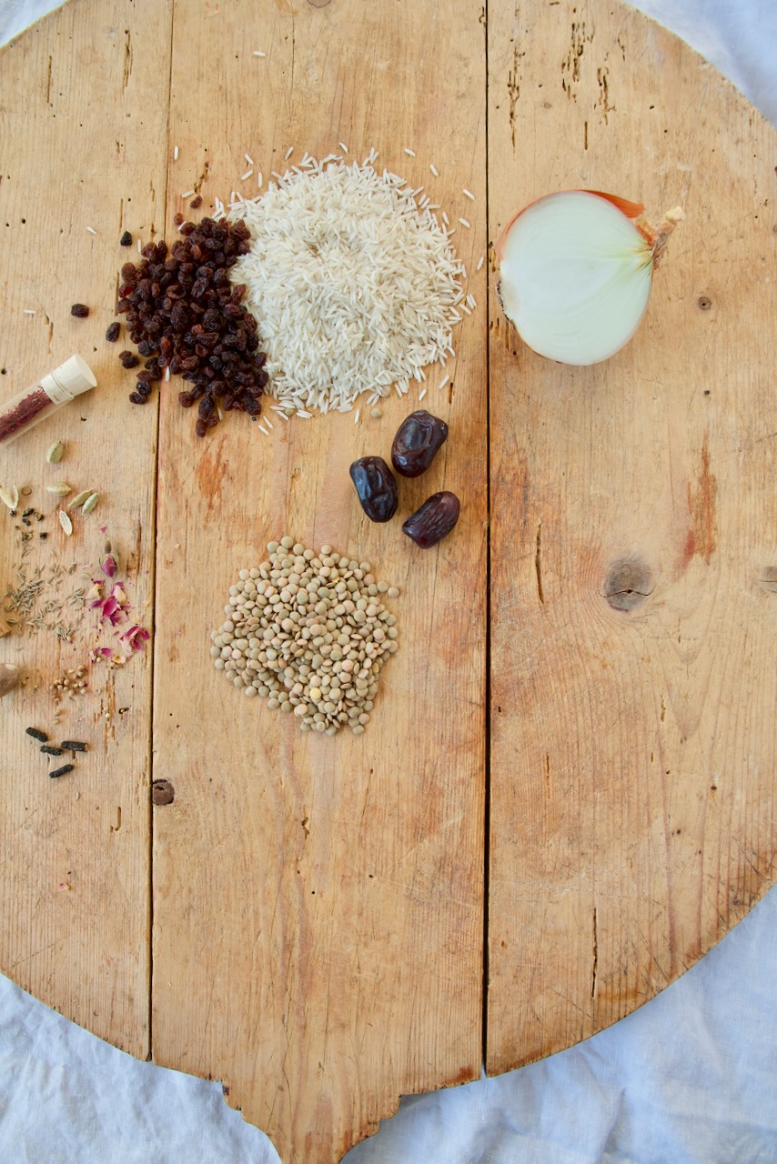 Layer rice and dried fruit-lentil mix over the bread on the bottom of the pot. Finishing with the rice.