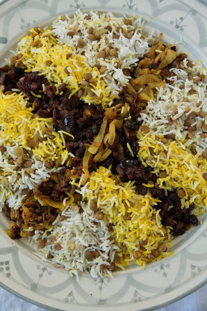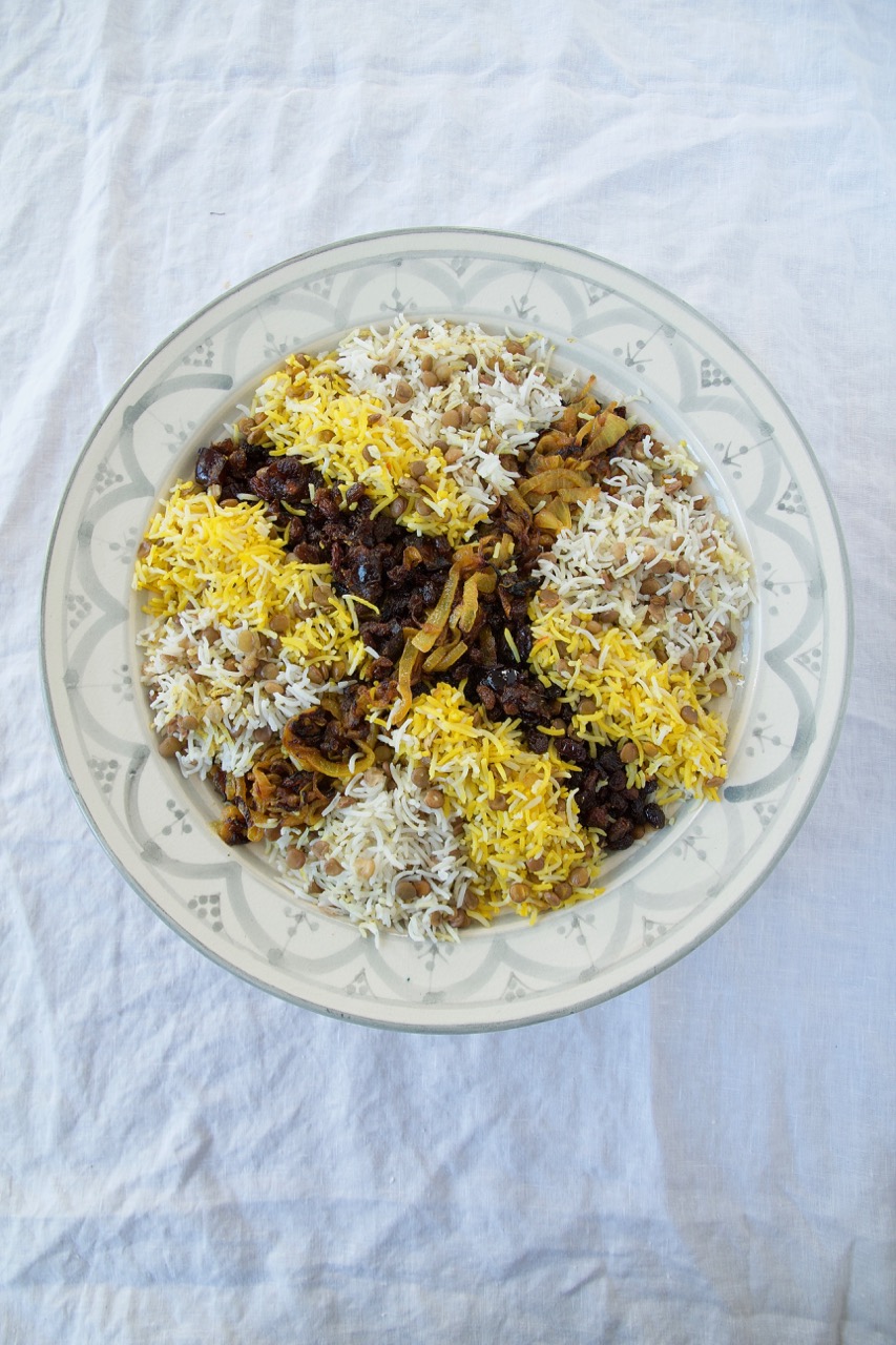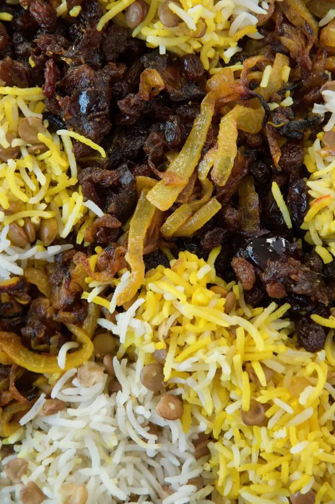 For presentation, create rows from rice, dried fruits + lentils, saffron rice, and caramelized onions. Don’t forget the crispy Tahdig—it’s the best part!