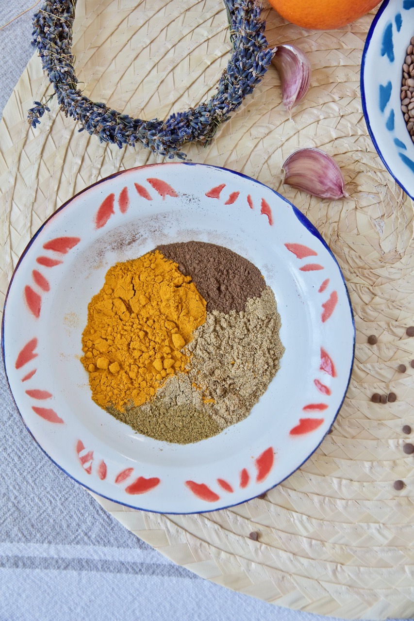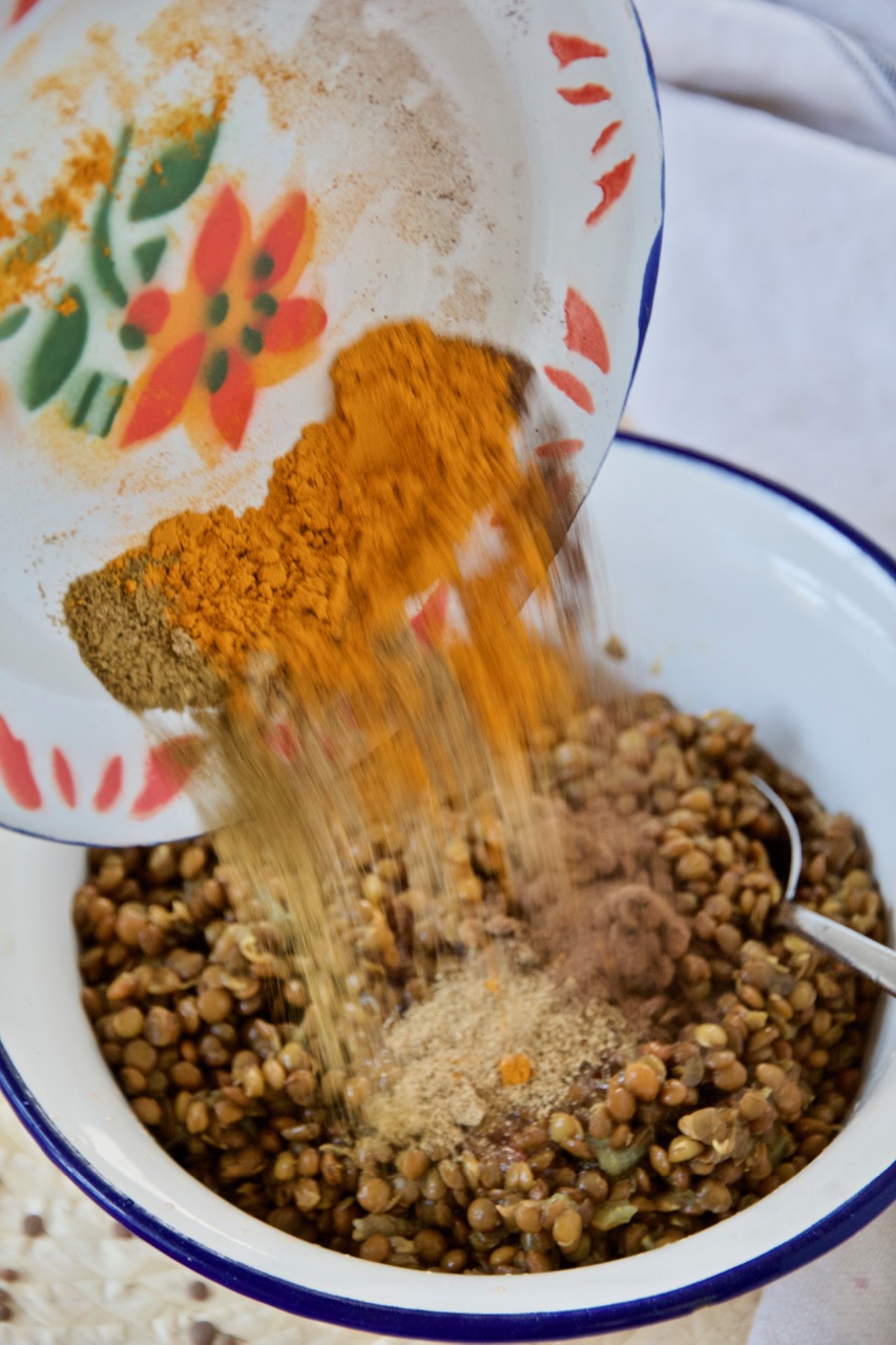 Put the cooked lentils, juice, and spice mix into a bowl and blend everything with a stick blender until it’s nice and creamy.