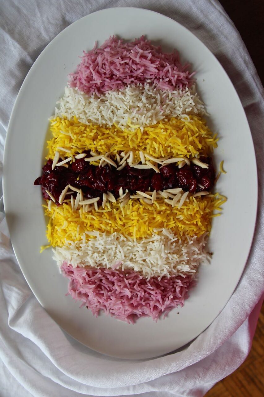 This dish pairs beautifully with Mast-o Khiar, a refreshing Persian yogurt dip with cucumbers, herbs, and golden raisins. It cools the palate and complements the rich flavors of the rice and lamb.