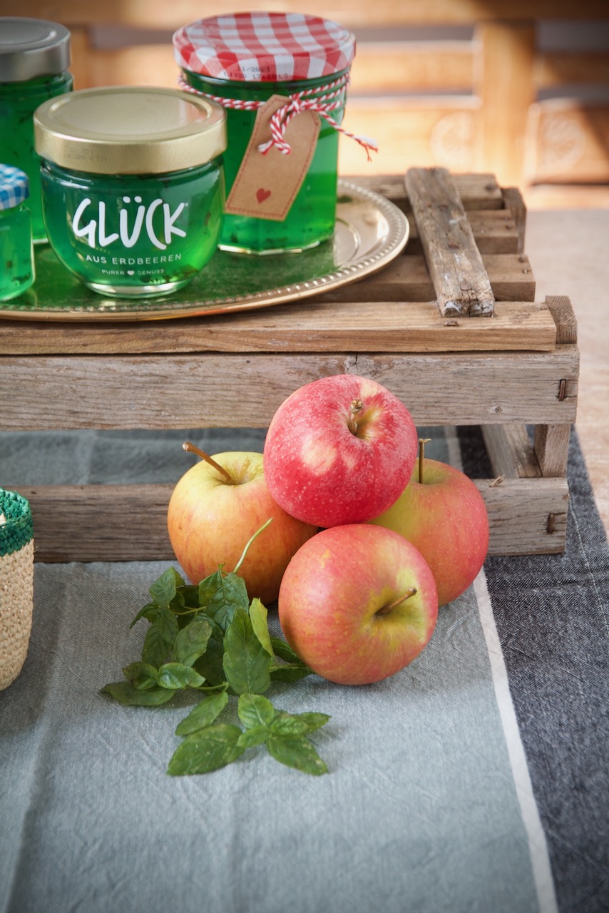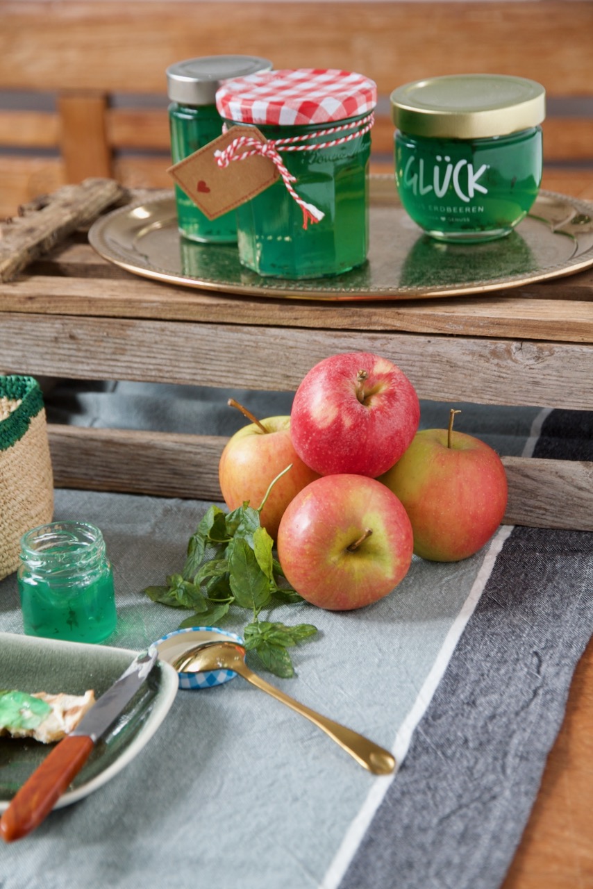 Today I welcome autumn with a dream in green. My delicious apple mint jelly gives pleasure to the palate and eyes at the same time. Quite fancy with mint, which also provides some freshness. This tastes very fine, and also looks great. In my green apple mint jelly, the finely chopped mint leaves are a great eye-catcher. One half I dyed with green food coloring* and the other half I left natural.