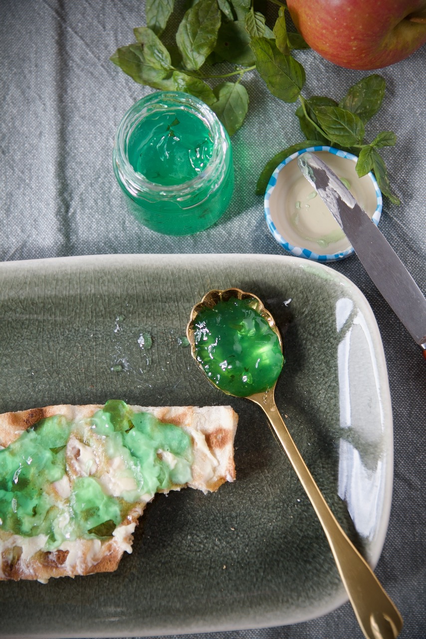 The jelly is great as a fruity spread for breakfast. Filled in pretty glasses, the Apple Mint Jelly is also a fancy gift idea. In addition, a great souvenir for friends, parties, or brunch. You can use apple mint jelly as a spread, for baking, or as an ingredient in desserts or compotes. It also tastes delicious as a side dish to cheese platters!