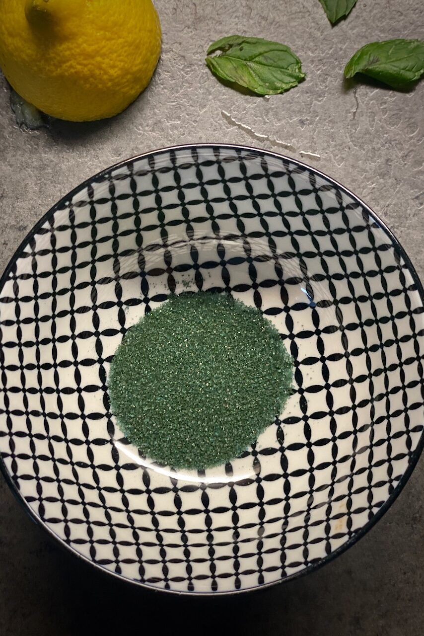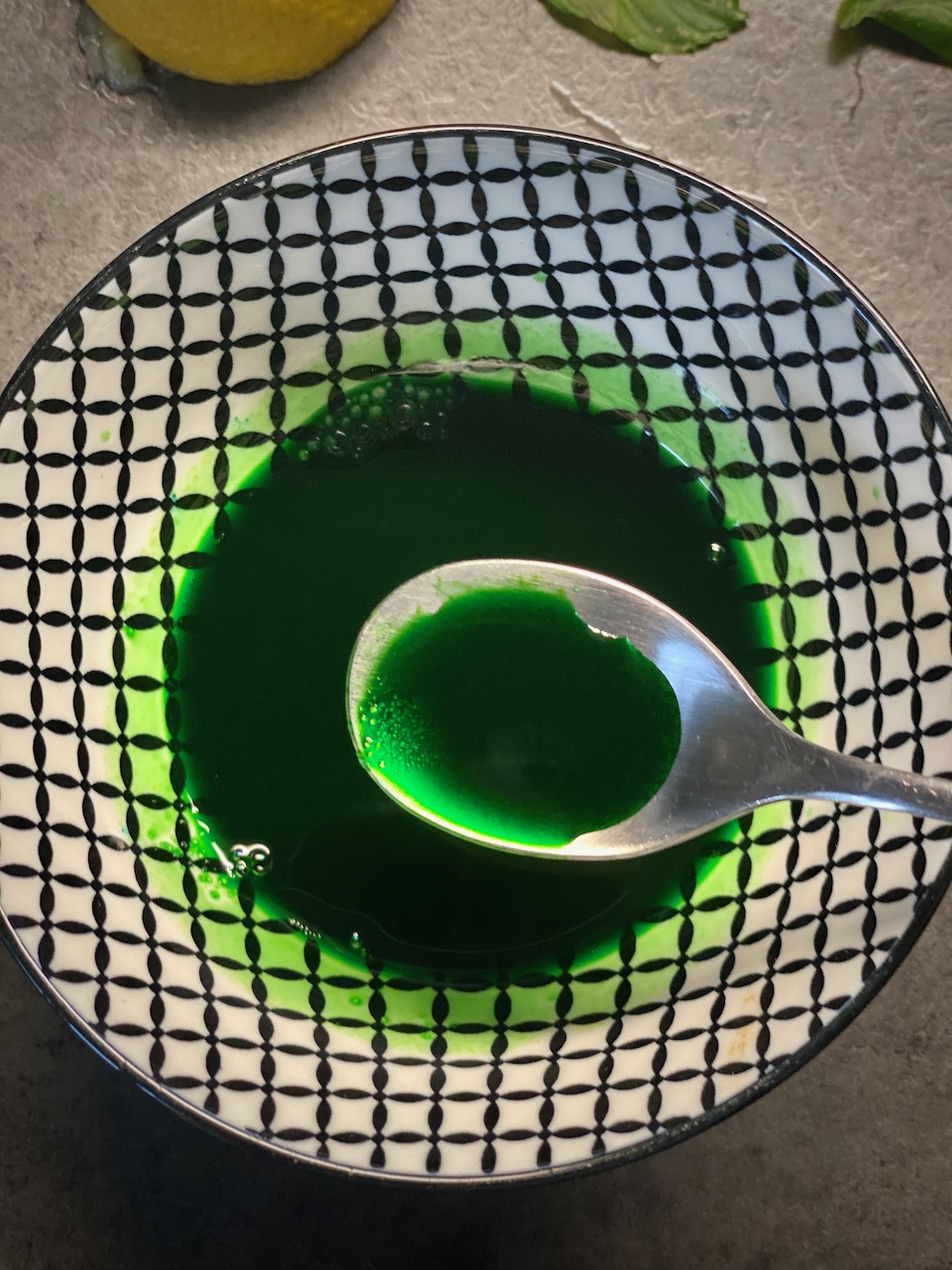 Remove the saucepan from the heat and let cool slightly, in the meantime dissolve the food coloring according to package directions and stir 1 tablespoon of it into half of the juice, then stir in the finely chopped mint. Fill jelly to the top into hot and sterilized jars* and close immediately with a twist-off lid. Allow to cool. Label jars with a chalk marker*.