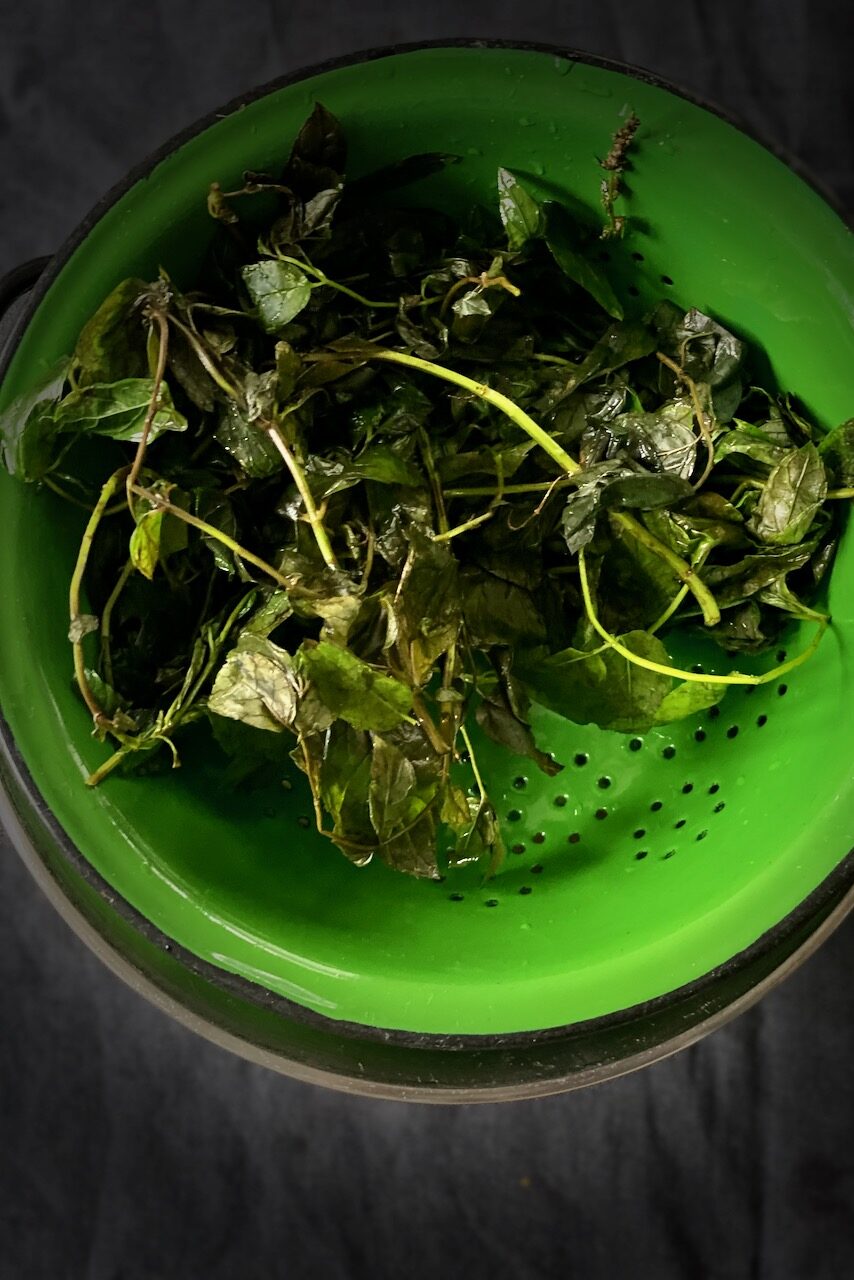 Wash the mint leaves, dry them well and clean them. Set aside 3 tablespoons of them, pour 125 ml of boiling water over the rest and let it infuse for about 15 minutes. Drain the infusion through a sieve. Set aside.
