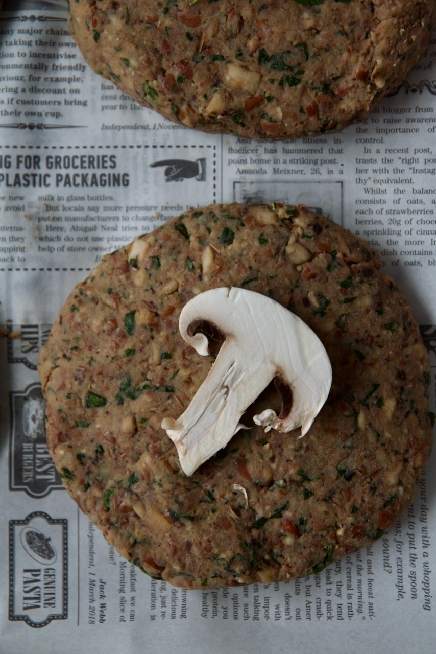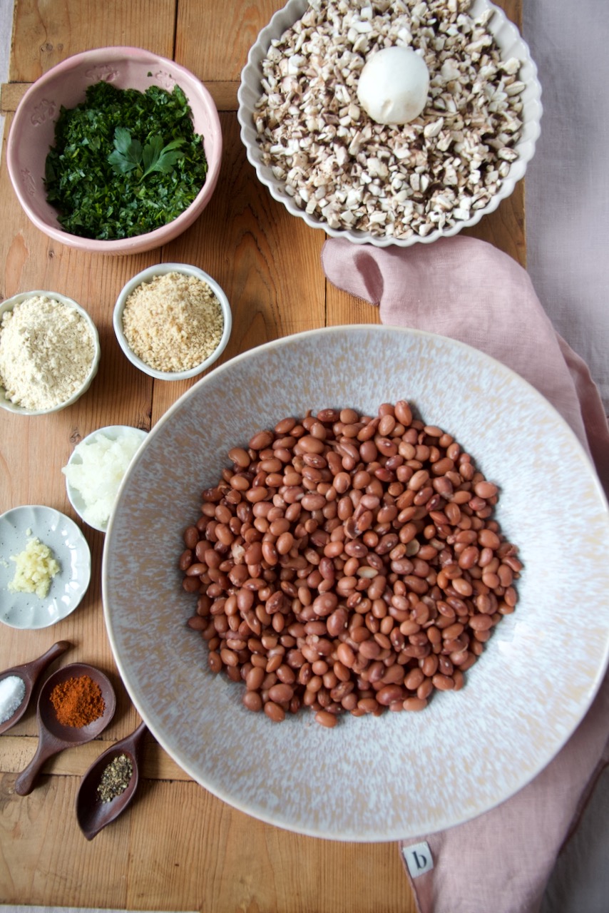 Pinto beans are also known as quail beans and are just perfect for burger patties. The preparation is also quite simple, but the beans should be soaked overnight. This makes them a lot easier to digest and reduces the cooking time hugely. The next day, cook them for about 30 minutes until soft. The cooked pinto beans should be cooled down before use. Then blend coarsely with chickpea flour and all other ingredients in a food processor, giving them a nice texture.