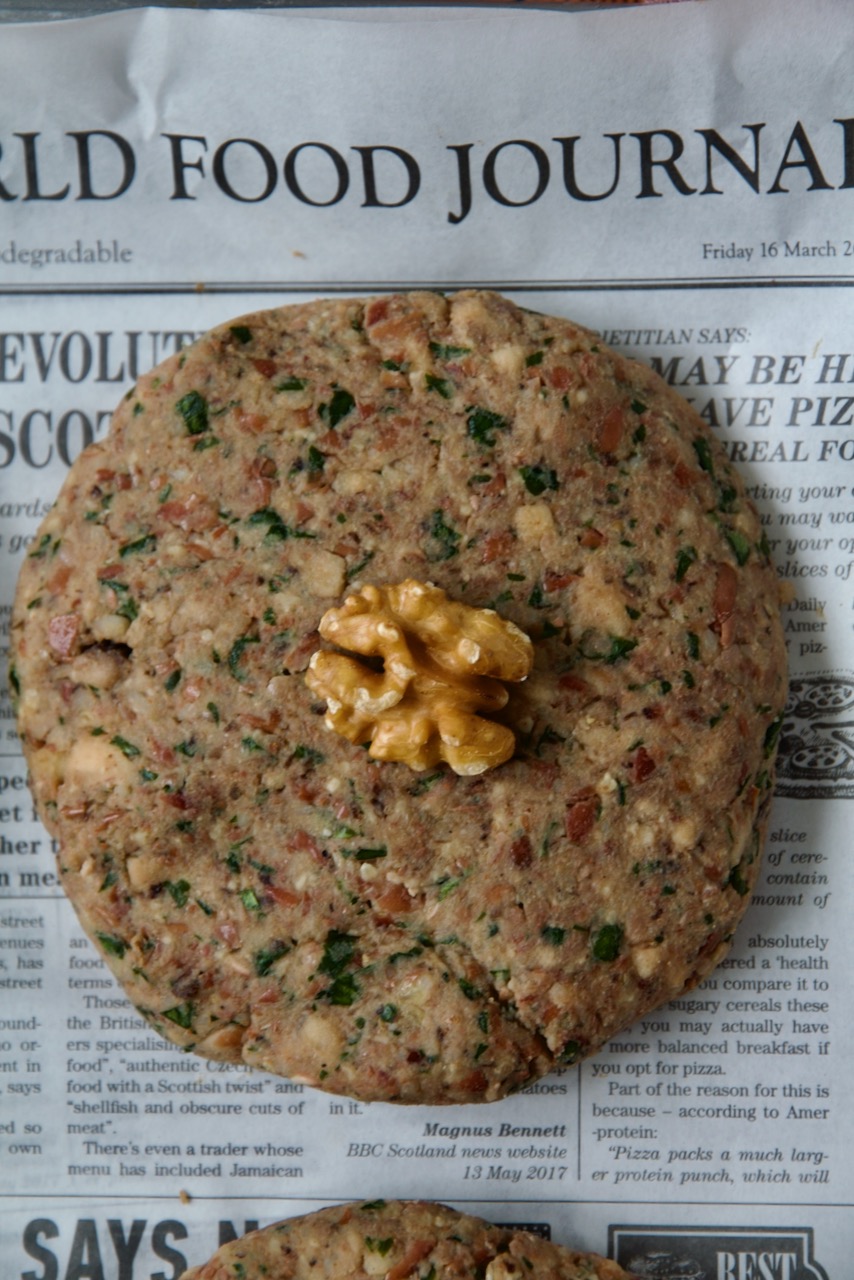 Put all the prepared ingredients with the spices and chickpea flour in a blender and mix coarsely. Place the mixture in the fridge for 1 hour. Then remove from the fridge, divide mixture into four equal portions and shape each into a patty.