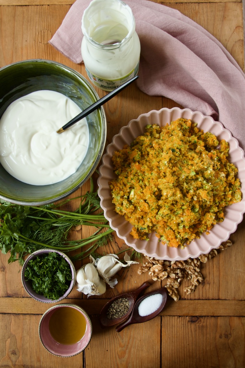• 3 zucchini3 carrots3 tbsp olive oil250 g “Only Natural” yoghurt2 cloves of garlic, pressed25 g dill , chopped25 g parsley, choppedSalt, pepper