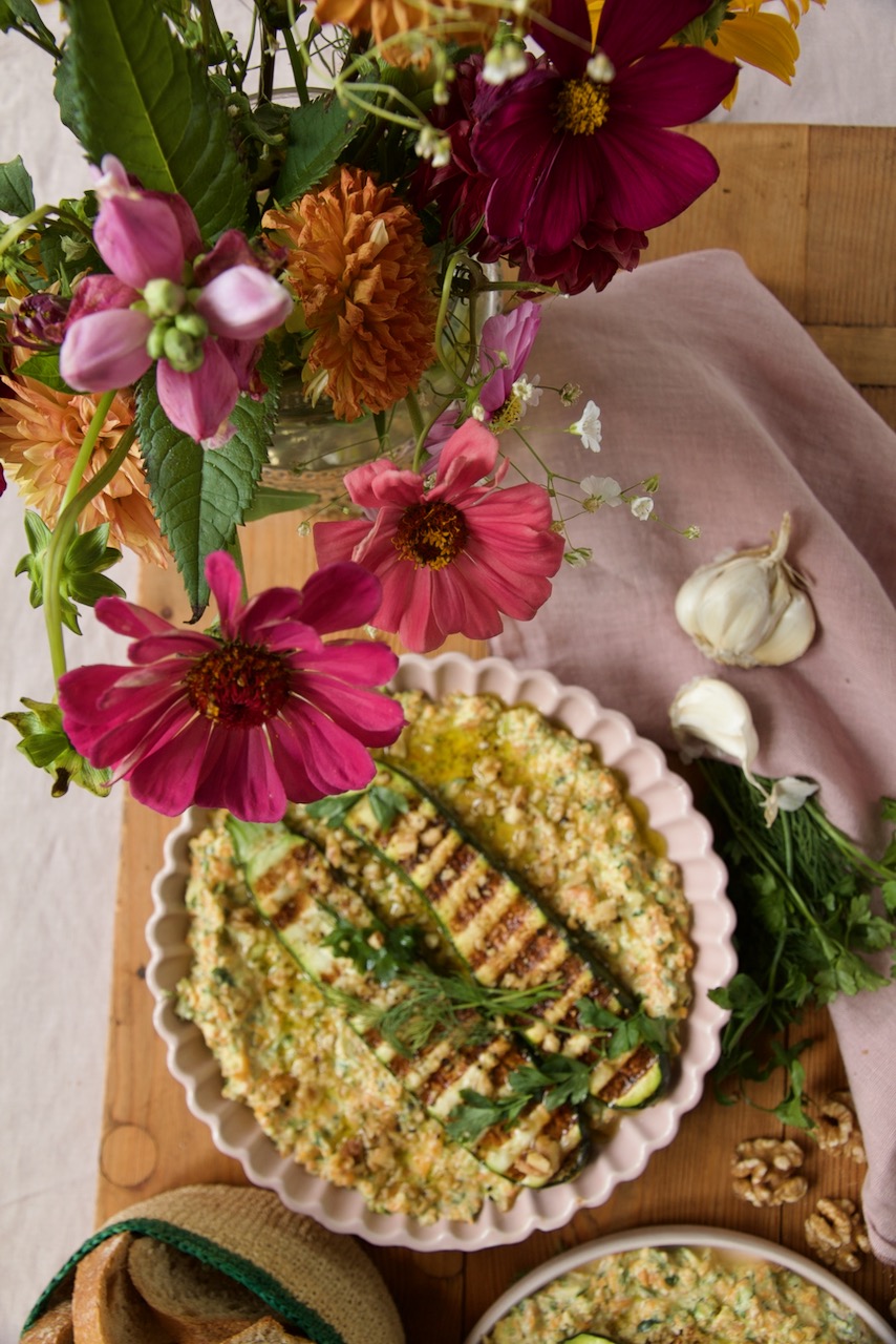 2. Spoon the yogurt dip into a dish and garnish with grilled zucchini stripes, olive oil, walnuts, a few dill, and parsley leaves.