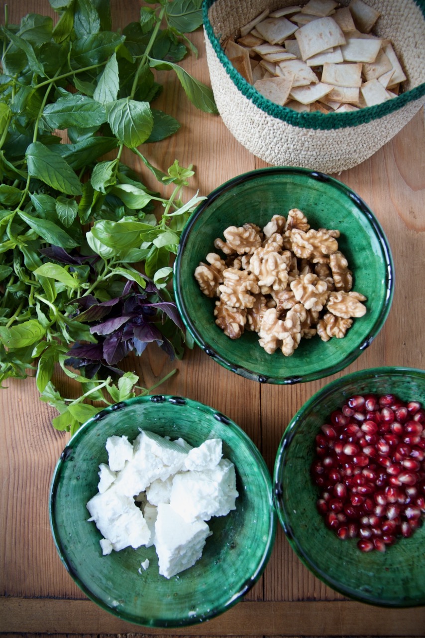 This dish has its origin in Persia in Qazvin and is called Doymaj or Dooymaj and is served as a cold dumpling. I serve this dish instead as a Bread Salad with Fresh Herbs. In the original doymaj recipe, we use old and dry lavash bread, but I toasted fresh Arabic bread in the oven. Persian lavash bread is one of the basic foods, you can find my really simple recipe here. We always have fresh lavash bread on hand and most of the time it is eaten, but sometimes we do have some left over. Bread is sacred in our culture and we prefer to dry it rather than throwing it away.