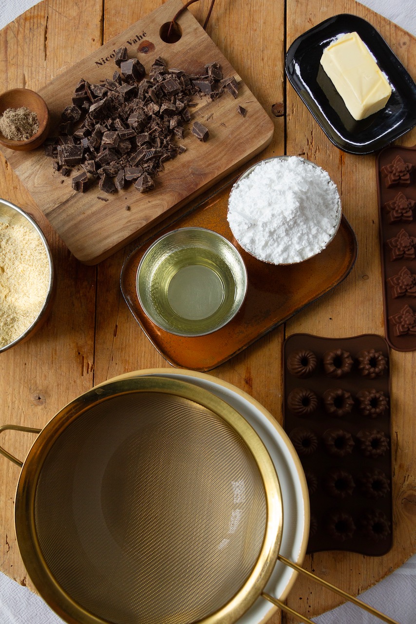 Once the couverture is melted, pour it into a piping bag and, depending on your preference, spread either 1/3 or half of it into the silicone molds. The molds do not need to be greased.