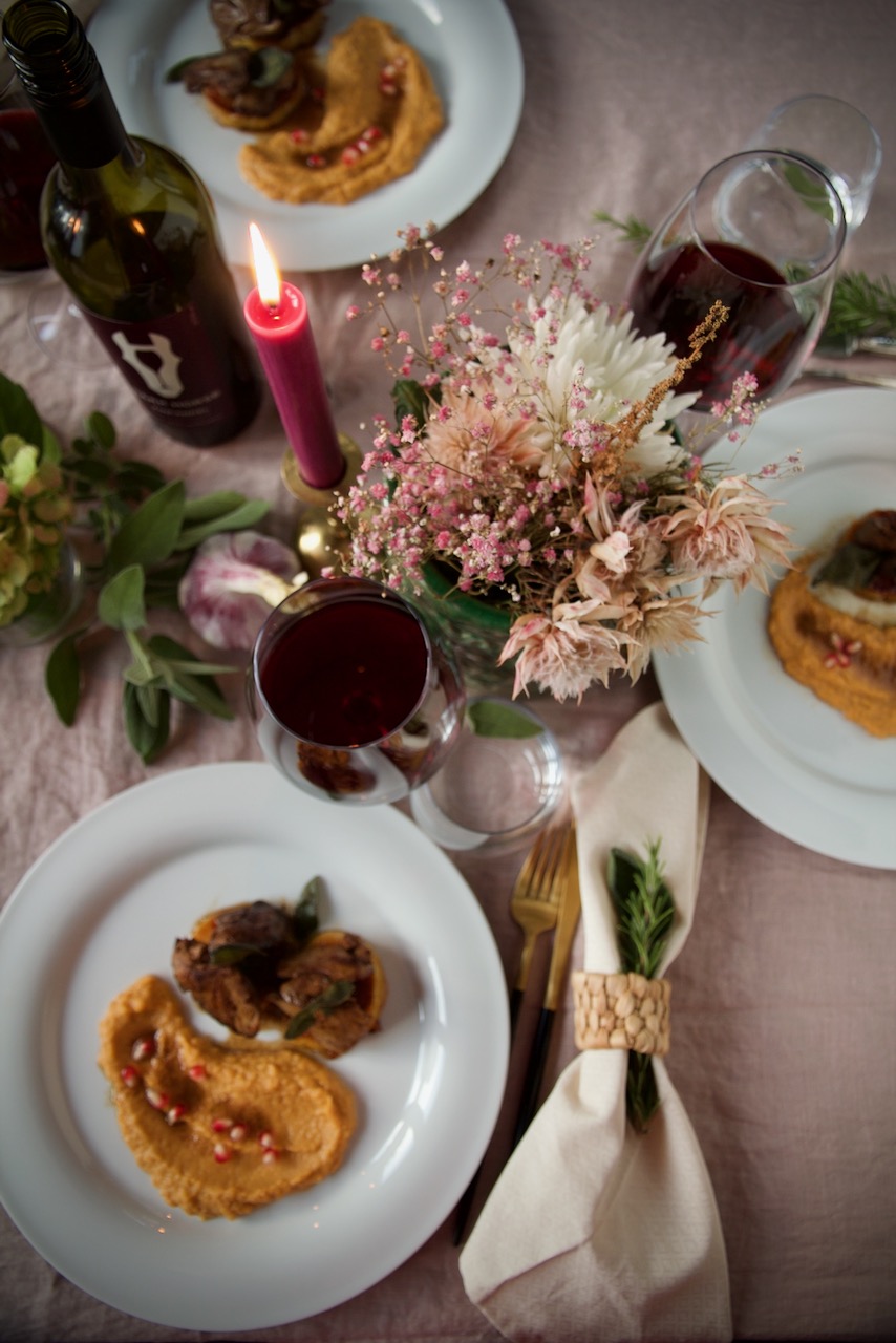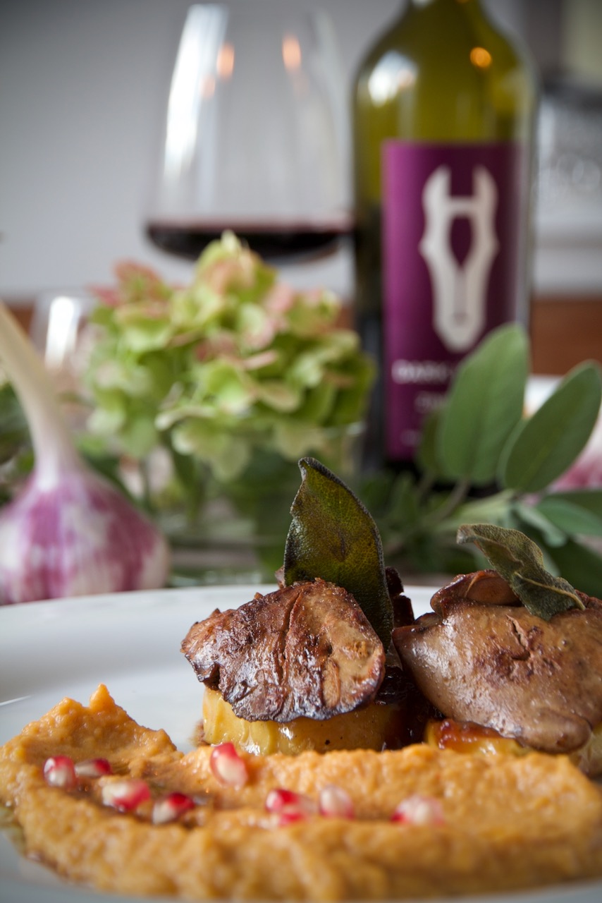 Chicken liver in pomegranate jus with quince rings sweet potato puree and Dark Horse Wine
