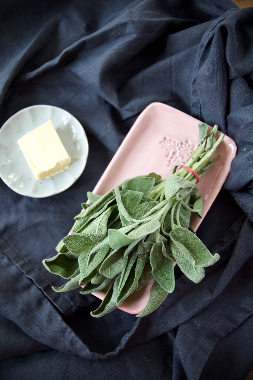 In a pan, melt the butter. Place the dry sage leaves next to each other in the pan and fry over a gentle heat until crispy on both sides.