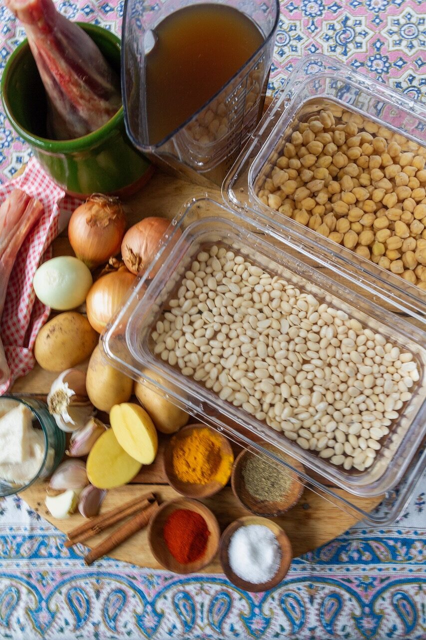 Place the lamb shank, lamb fat, white beans, and chickpeas into the clay pot, then cover with cold lamb stock or water.