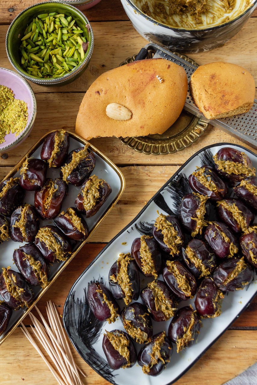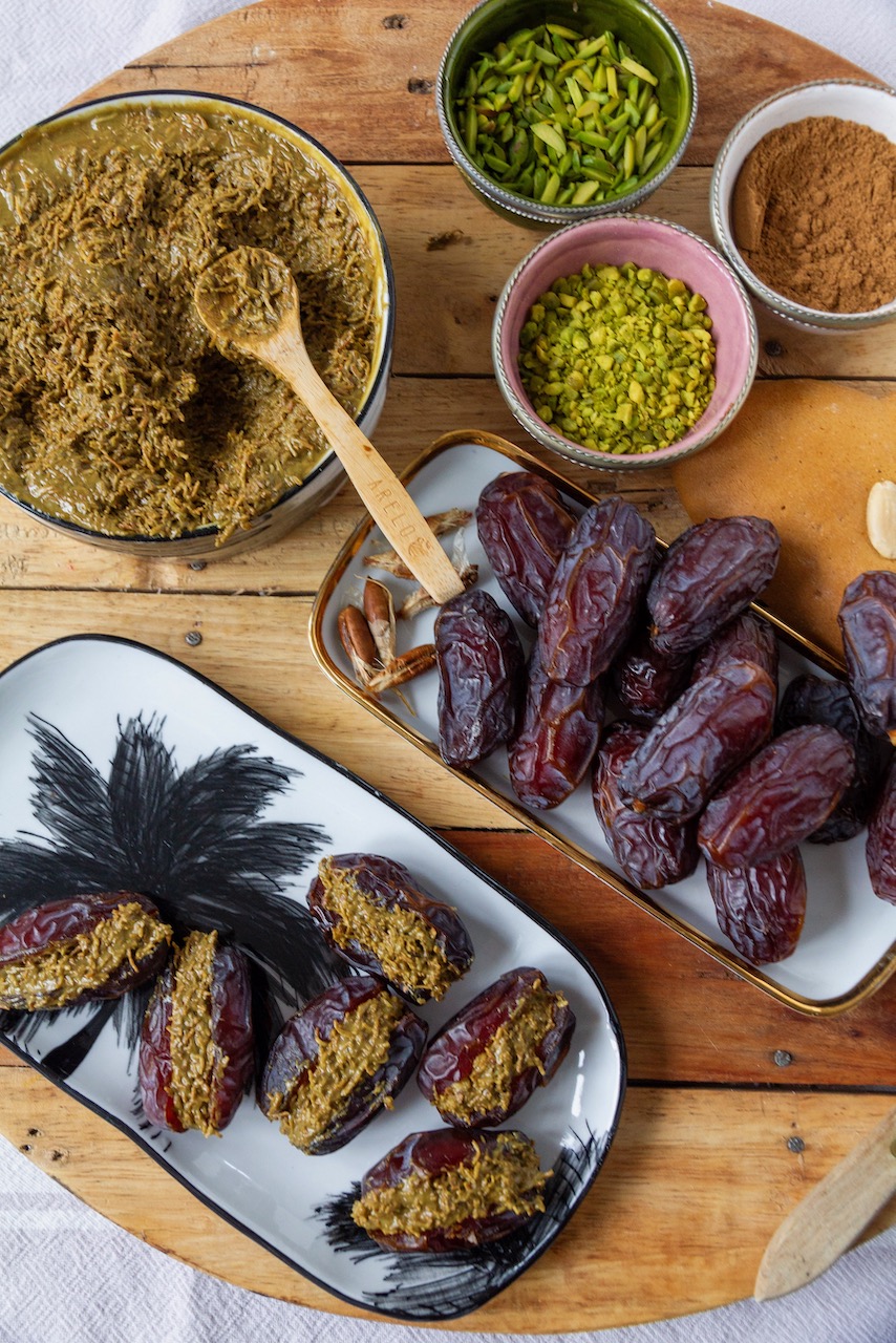 Imagine a cozy winter evening with a warm cup of tea, your favorite tunes playing in the background, and in front of you, a plate of shiny, festive dates packed with holiday spices and a satisfying crunch. These dates are filled with Kadayif, a Turkish shredded dough, creamy tahini, pistachio butter, and pistachio paste.