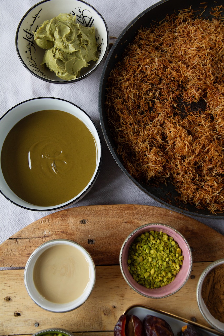 Melt the butter in a pan and fry the Kadayif until golden and crispy.