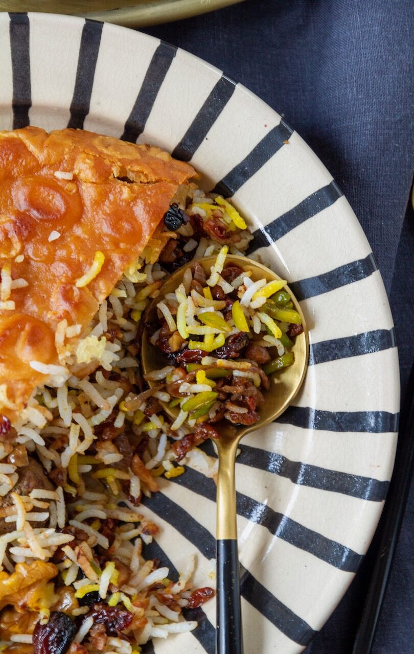 Pour the leftover bloomed saffron over the rice and poke a few holes in the mound with a wooden spoon.