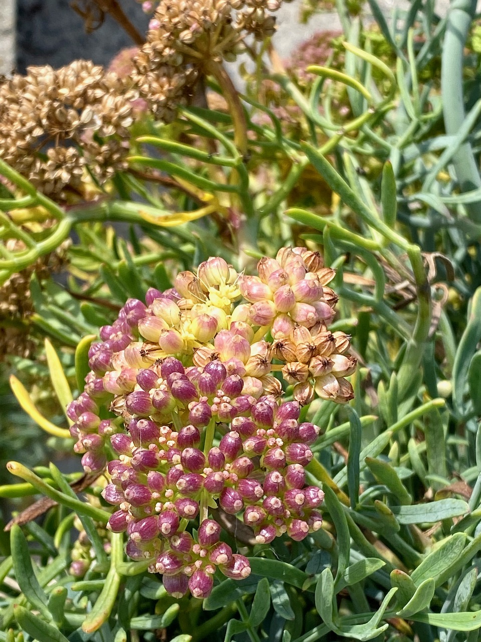 We walk from the port towards Pointe de Men Meuer along the wild coast. This coastal village is stunningly idyllic, framed by beautiful granite stone houses with blue shutters and old bigouden villas. Nils Henkel stops at a rocky wall on the shore, where lots of sea fennel grows. Sea fennel looks a bit like a succulent, and its tiny leaves contain really concentrated aromas. It only grows on rocky coasts in the influence of the sea spray.