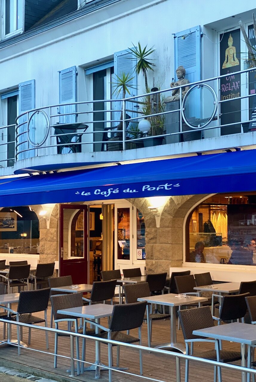 The charming Café du Port is a restaurant and a place to be. It has a magnificent location on the idyllic harbor and offers high-quality Breton dishes. Right at the entrance, you can find an aquarium filled with freshly caught lobster, crabs, and other seafood from the coastal fishery. Its ceilings and walls are covered with tropical wood, and its large windows and handrails remind us of the interior of a ship. We start the evening with a glass of Kir Breton, an aperitif made with crème de cassis (blackcurrant liqueur) and chilled dry Breton cider, bright red in the glass, and simply delicious! Cidre is the equivalent of our Hessian Apfelwein and the have to drink in Brittany. The “Fouesnant of Manoir du Kinkiz” is one of the best ciders in Brittany.