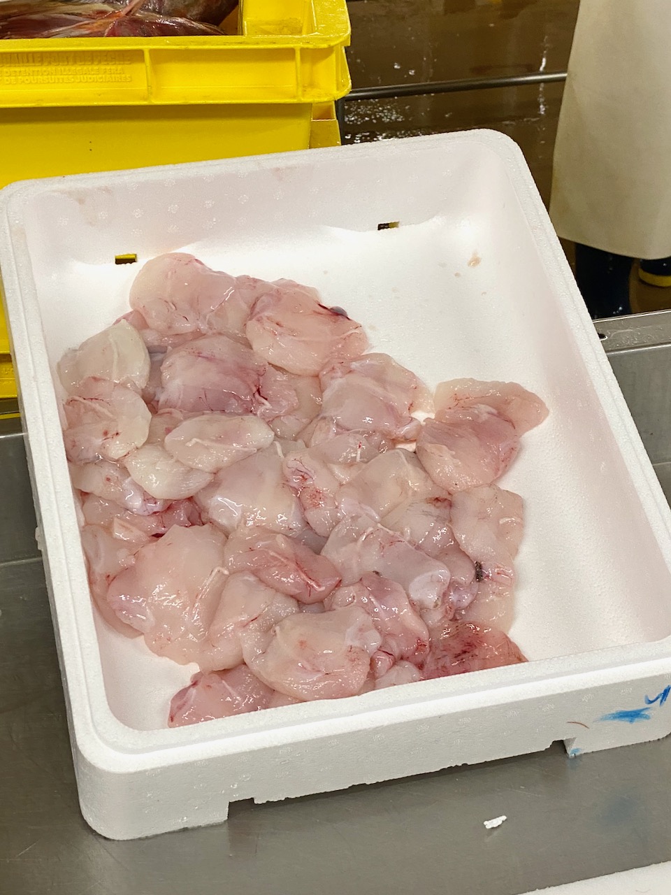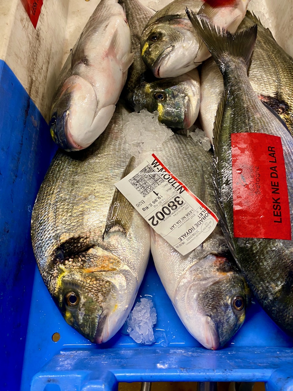 The monkfish (Lotte in French) and its bizzare look is the eye-catcher of the day. Our guide tells us that a monkfish (sea devil) is a “ground fish”, which lies well camouflaged on the seafloor and that the smallest weigh at least 4 kg. Its body is flat, and it has no scales. The head is exceptionally wide, the eyes are tight, and the enormous mouth is full of sharp teeth. Not surprising that he is called monkfish, due to this creepy look.