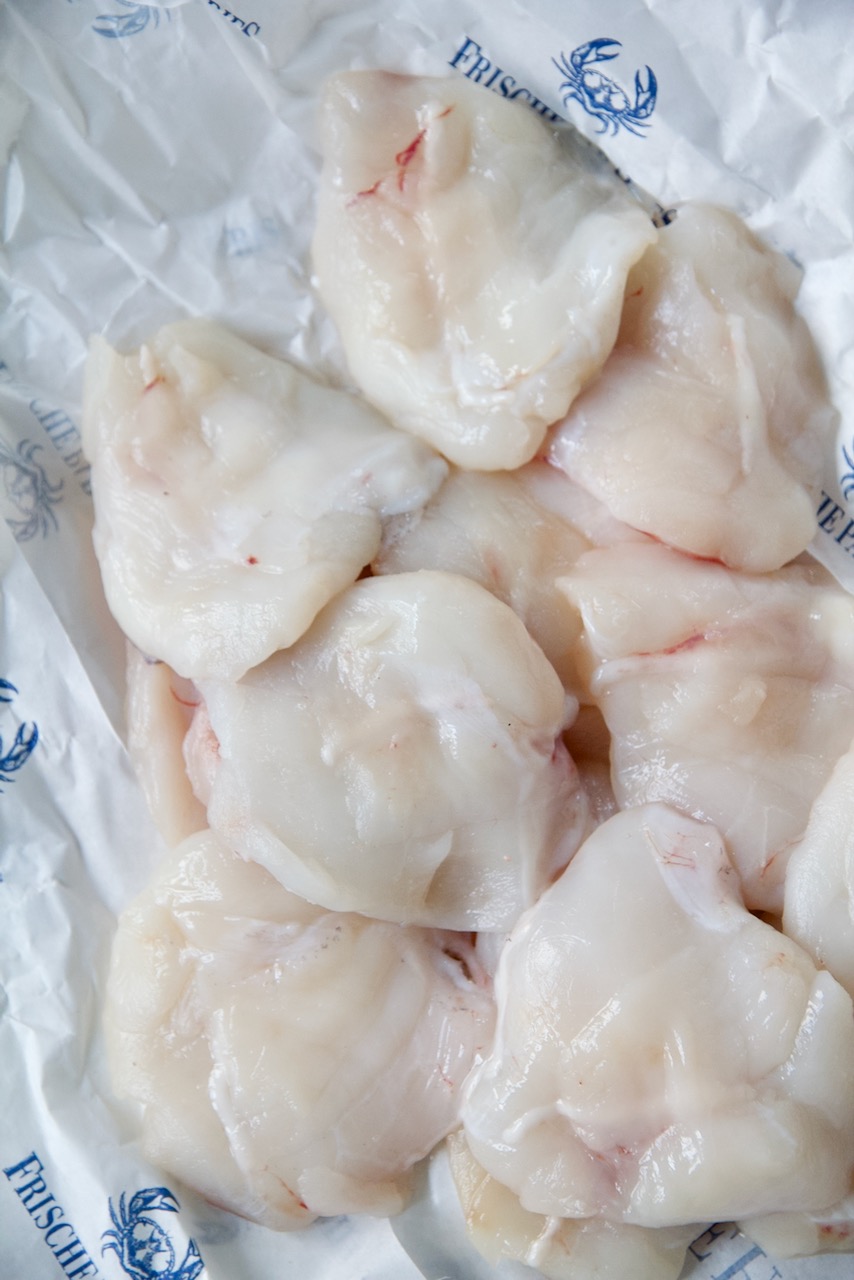 The Monkfish lies on the bottom of the ocean and ambush fish attracted to an antenna that’s used as bait. Once fish draw near, the monkfish strikes quickly and can swallow fish that is nearly its size! The flavor of monkfish is compared to lobster, but it often costs a fraction of the amount. This has led to monkfish being called “the poor man’s lobster.” That’s why it is desired in gourmet cuisine, by the way, only the queue du Lotte (the tailpiece) and the joue du Lotte (cheeks) are used in haute cuisine. Its white, firm, and boneless meat is a real treat.