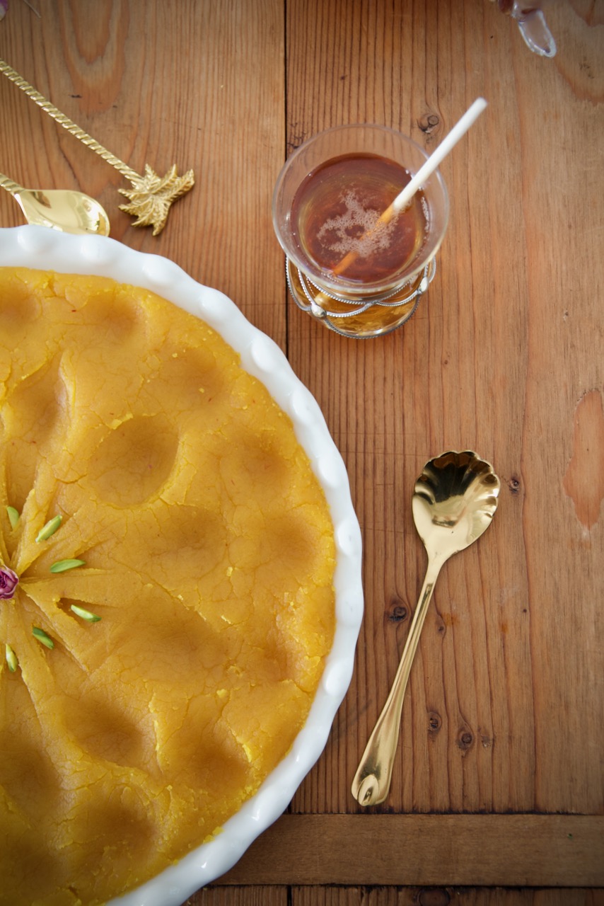 The Persian Halva Safarani حلوا زعفرانی is very different from the Halva you know from Turkish or Arabic stores. This recipe is an old and classic version made from wheat flour and oil or butter. Saffron is responsible for a beautiful color and at the same time revitalizes the soul. Sugar adds sweetness, rose water a light floral aroma and warming cardamom a light tangy citrus note. We often enjoy this uncomplicated yet spectacular dessert with Nan-e Barbari for breakfast. Halva means “sweet” and dates back to 7th century Persia. If you prepare it with oil like I did in this recipe, you even have a delicious vegan dessert. Let it melt in your mouth!