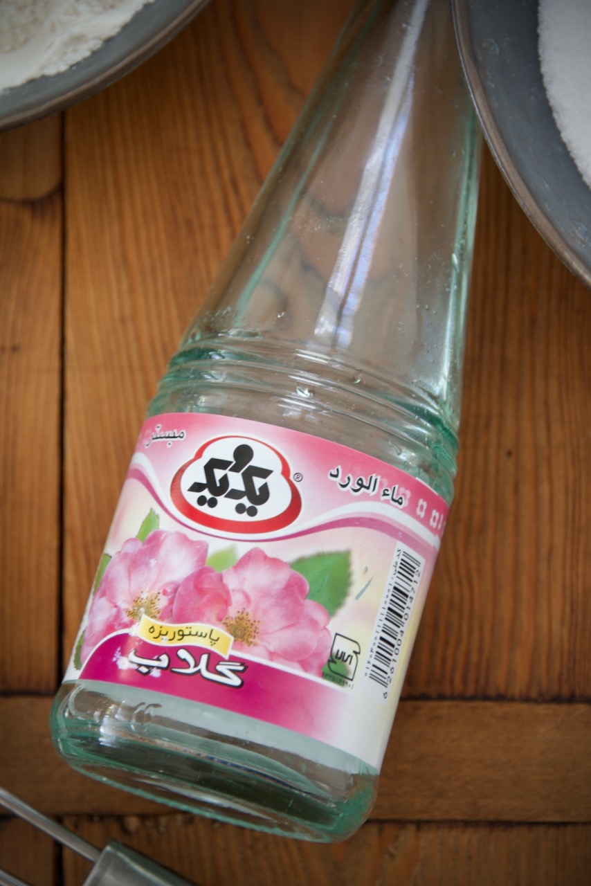 Grind saffron threads finely in a mortar and add one or two ice cubes and let them melt. Add sugar and water to a saucepan and heat until sugar is dissolved, do not bring to a boil. Add saffron threads and cardamom powder and add according to taste more or less rose water, remove from heat and set aside.