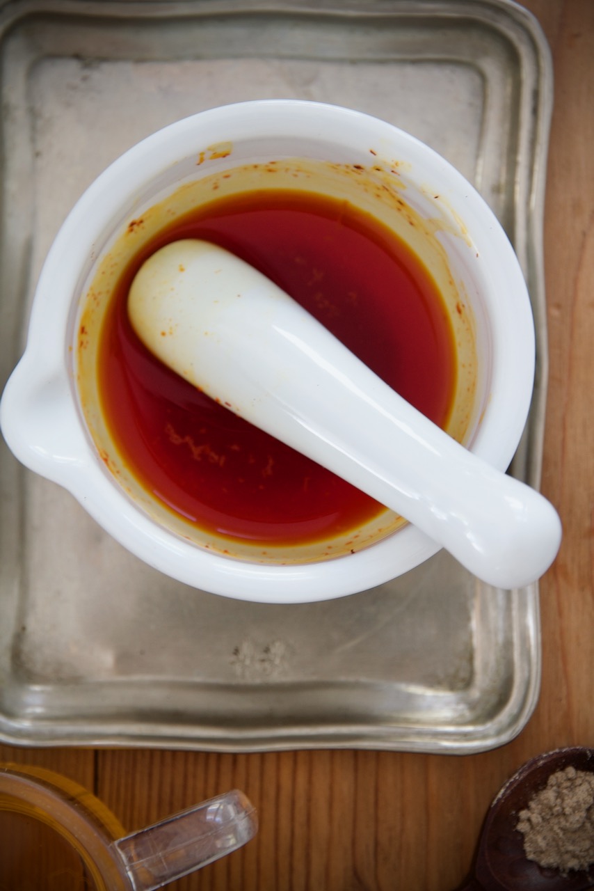 1. Grind saffron threads finely in a mortar and add one or two ice cubes and let them melt.