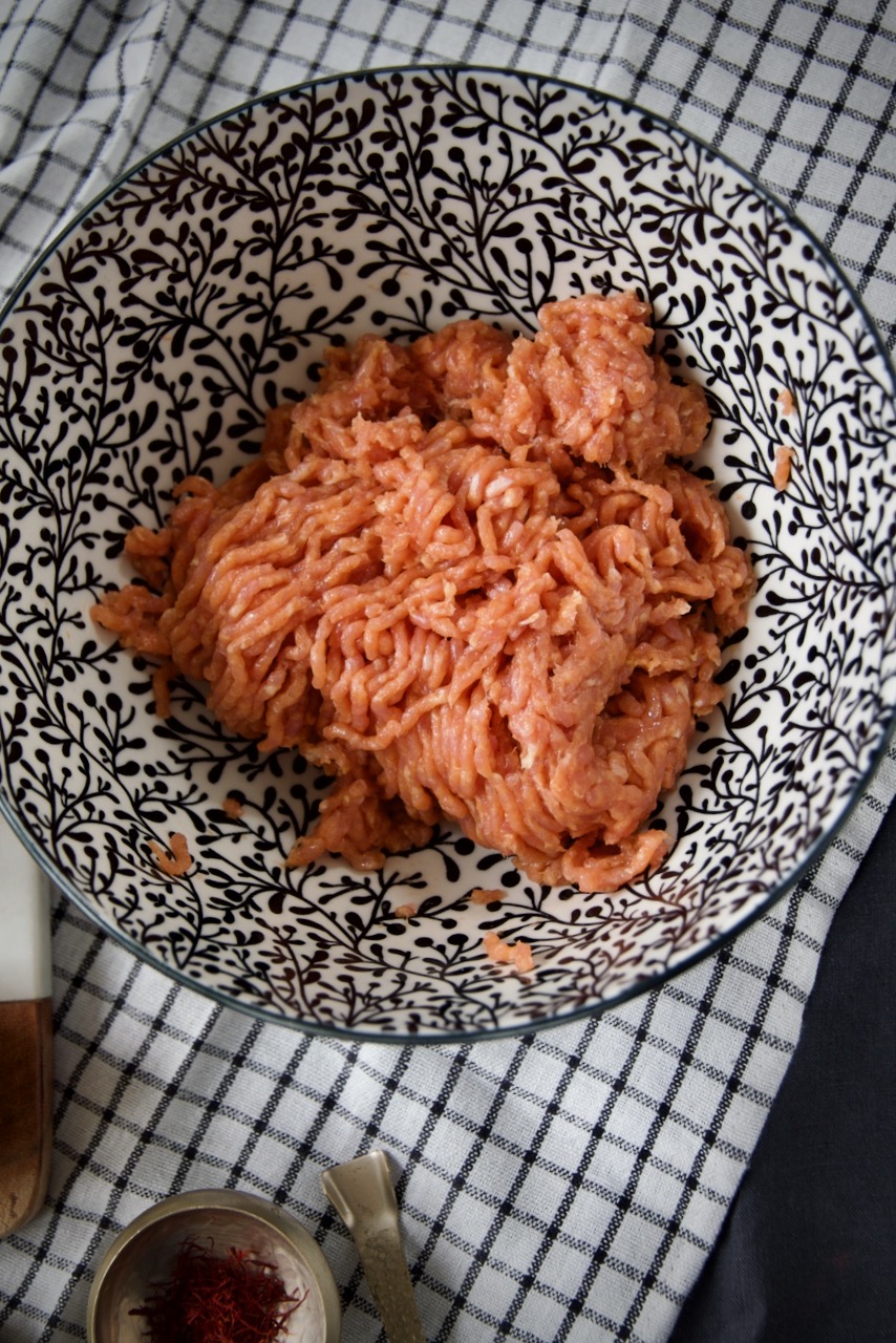 It is not easy to get minced chicken. I have a Kitchenaid* with a meat mincer and I make my minced meat from the chicken fillet. But you can easily make your chicken mince without a Kitchenaid. To do this, spread chicken mince on a tray and put it in the freezer for 20 minutes. Then place the frozen chicken fillets in a food processor* and chop for 3-5 seconds. Your chicken mince is ready.