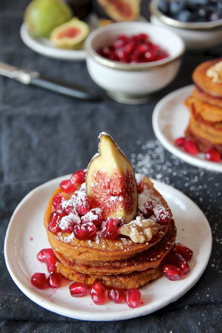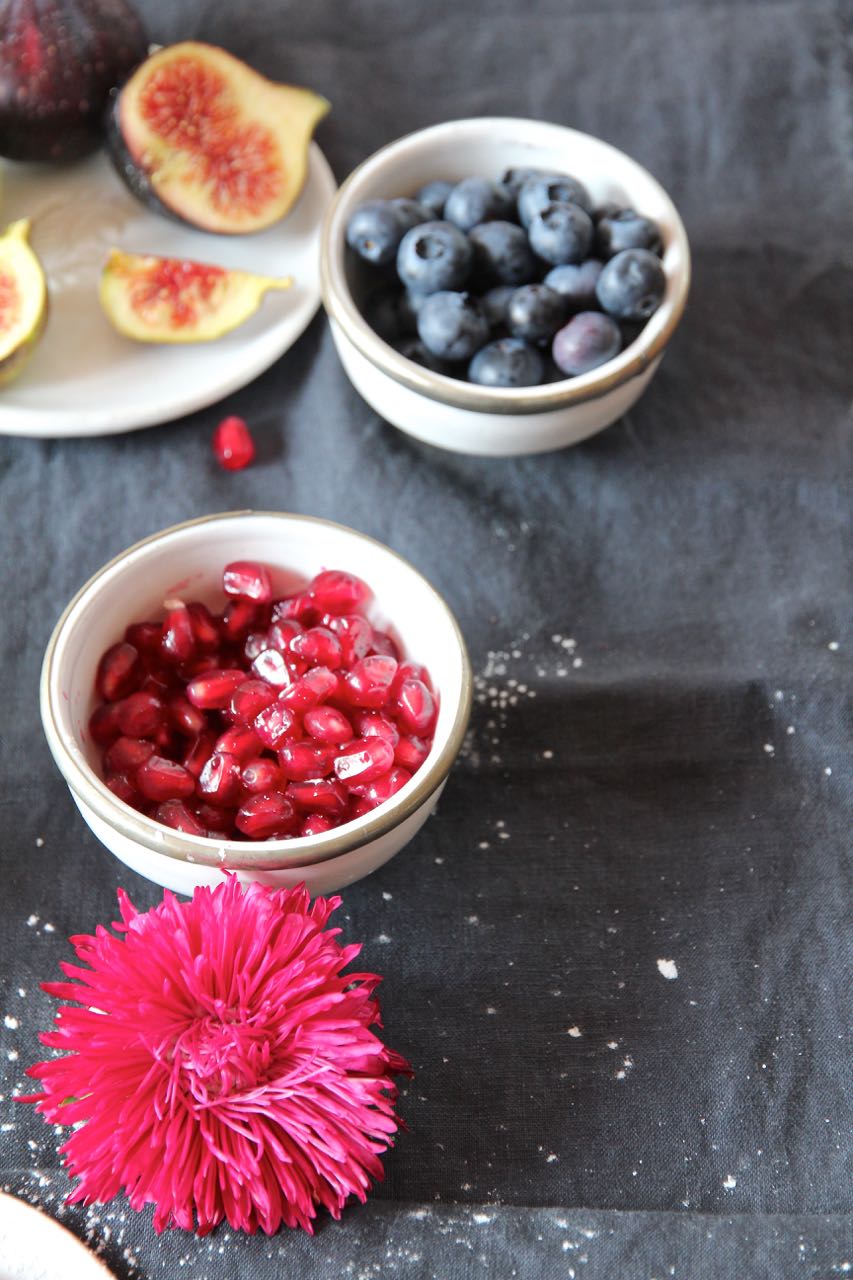 Dust with powdered sugar or drizzle with date syrup. Add pomegranate seeds, figs, and blueberries on top.