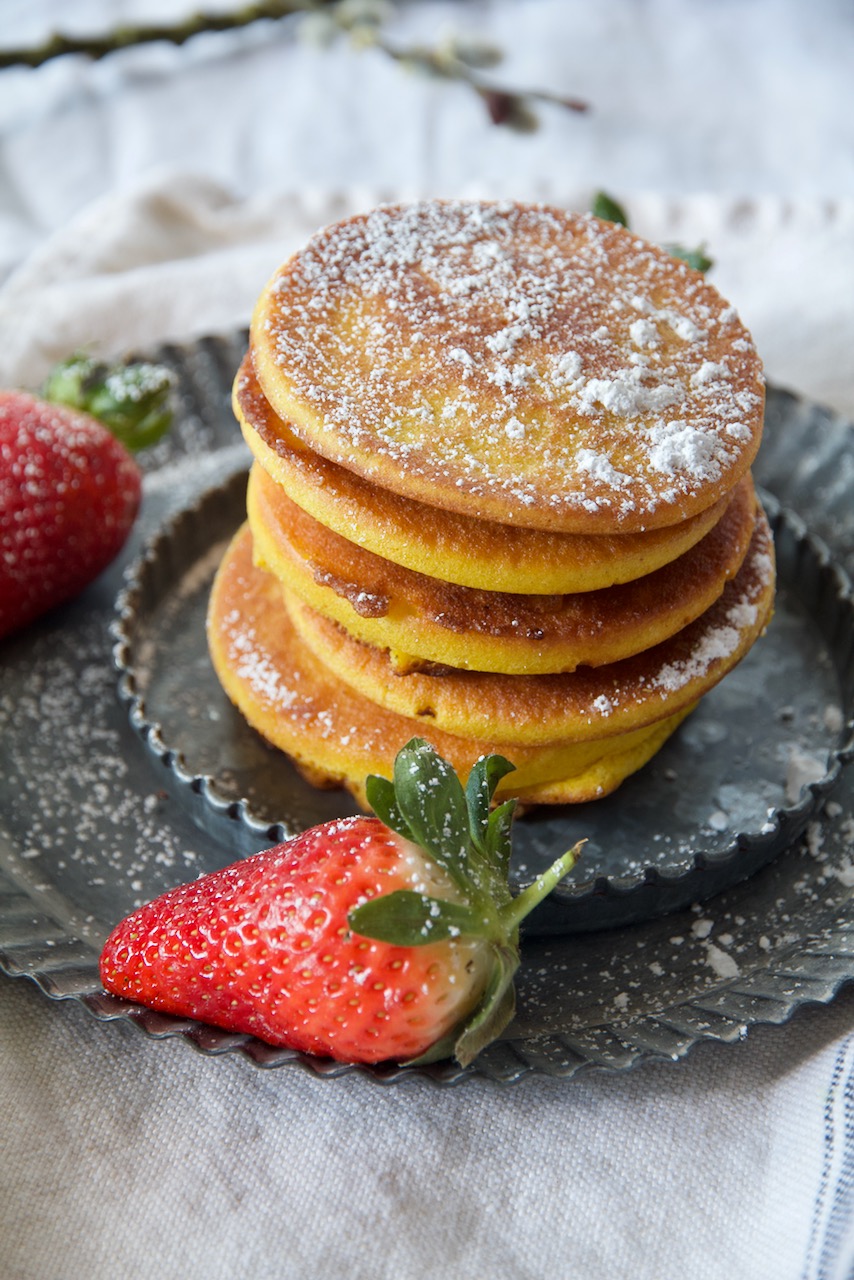 The batter is made with lots of eggs, which makes the pancakes soft and rich.