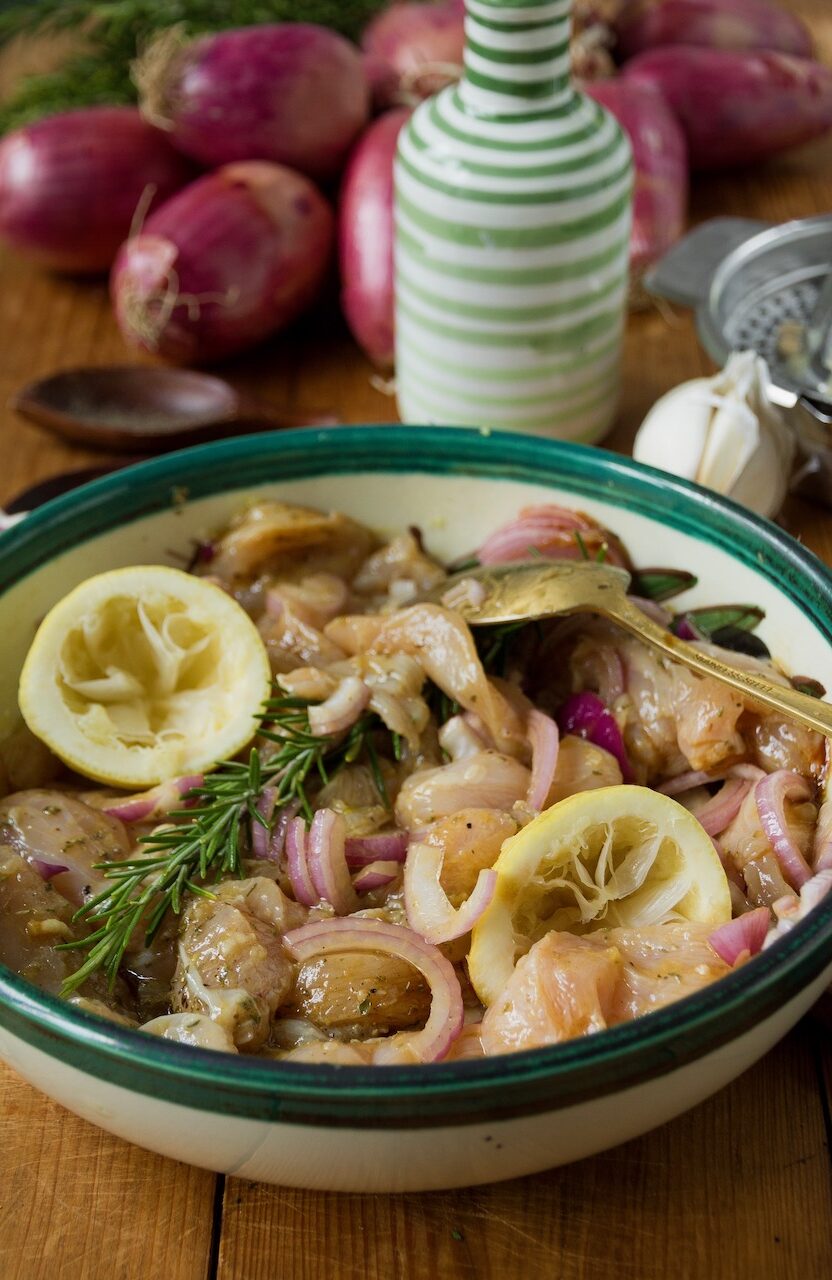 Sear the marinated chicken without the rosemary, but with more sliced onion until lightly browned.