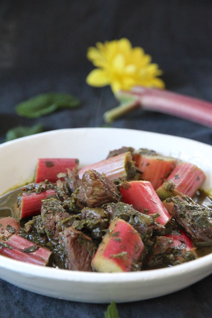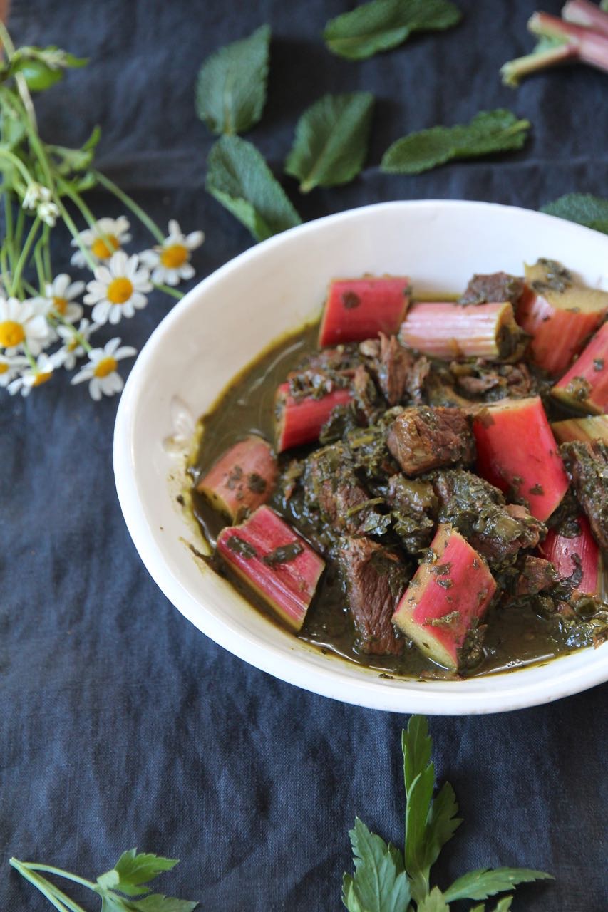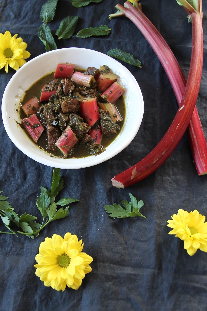 An aromatic Persian stew made with juicy beef and sweet-sour rhubarb in a spicy fresh mint-parsley sauce enhanced with saffron and pomegranate molasses.