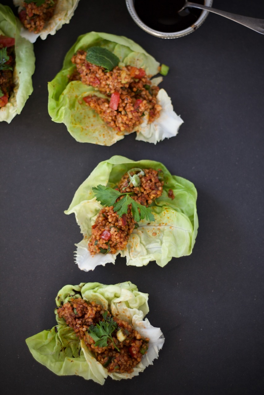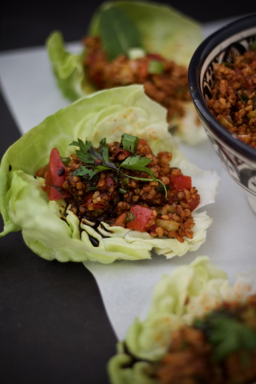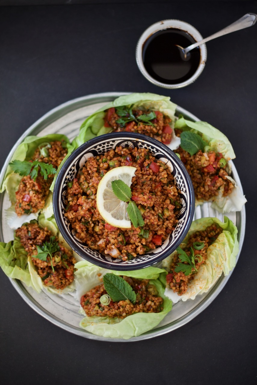 The best way to eat bulgur salad is with a leaf of lettuce. Take a tablespoon of kisir and place it in the middle of a lettuce leaf and then roll it into a wrap.