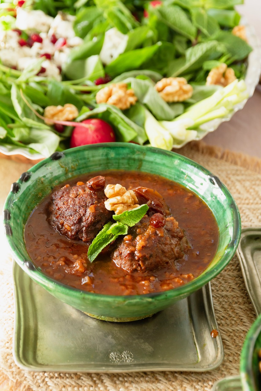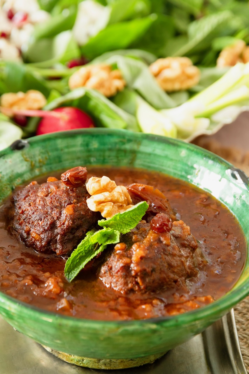 The meatballs are filled with dried apricots, walnuts, and raisins, and then simmered in a delectable sauce made with pomegranate molasses, tomato paste, and rice.