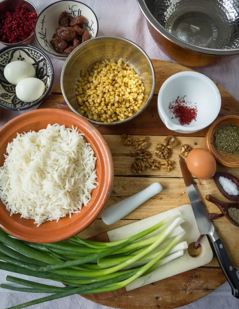 Mix spring onions, tarragon, split peas, and beef, then add rice, saffron, egg, salt, and pepper. Knead well.