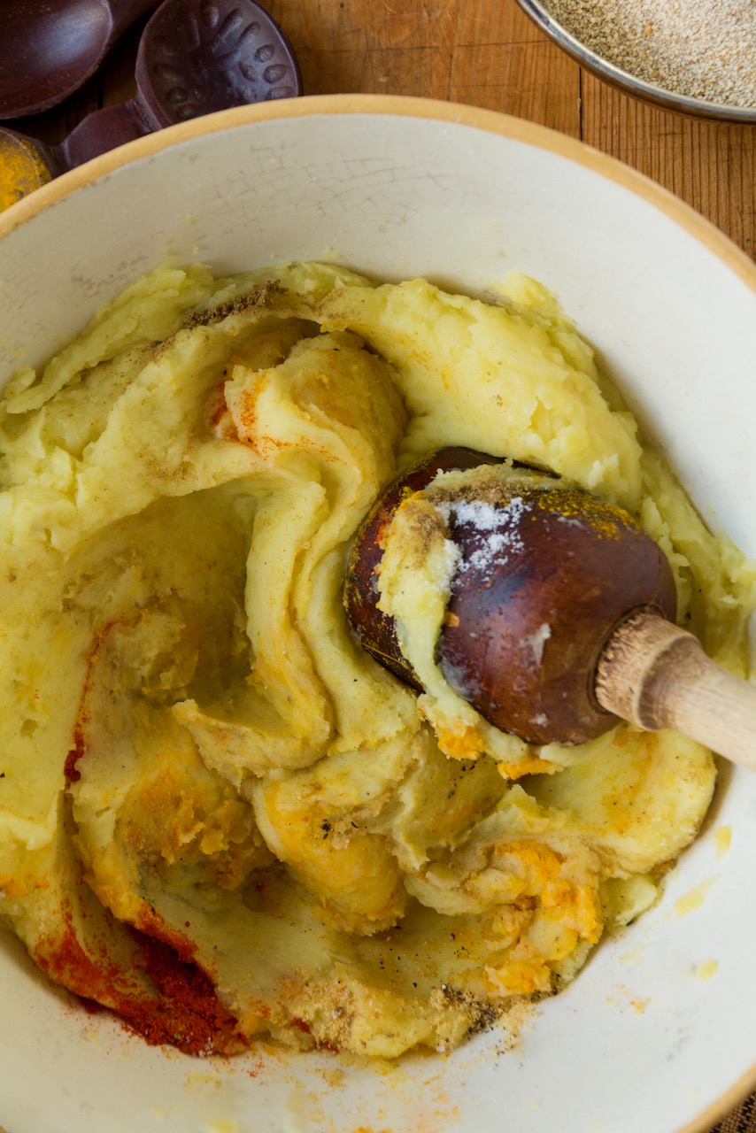 Mix well with the spices, salt, turmeric, coriander, paprika, garlic, onion powder and breadcrumbs.
