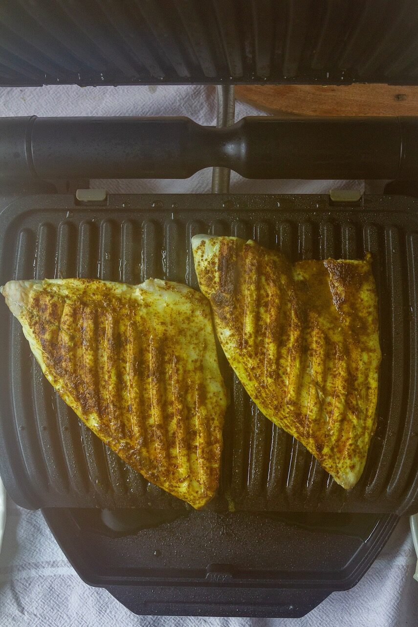 Preheat a contact grill or grill pan and lightly grease it with oil. Grill the seasoned fillets on both sides until they are golden brown and flaky, about 5 to 6 minutes per side.