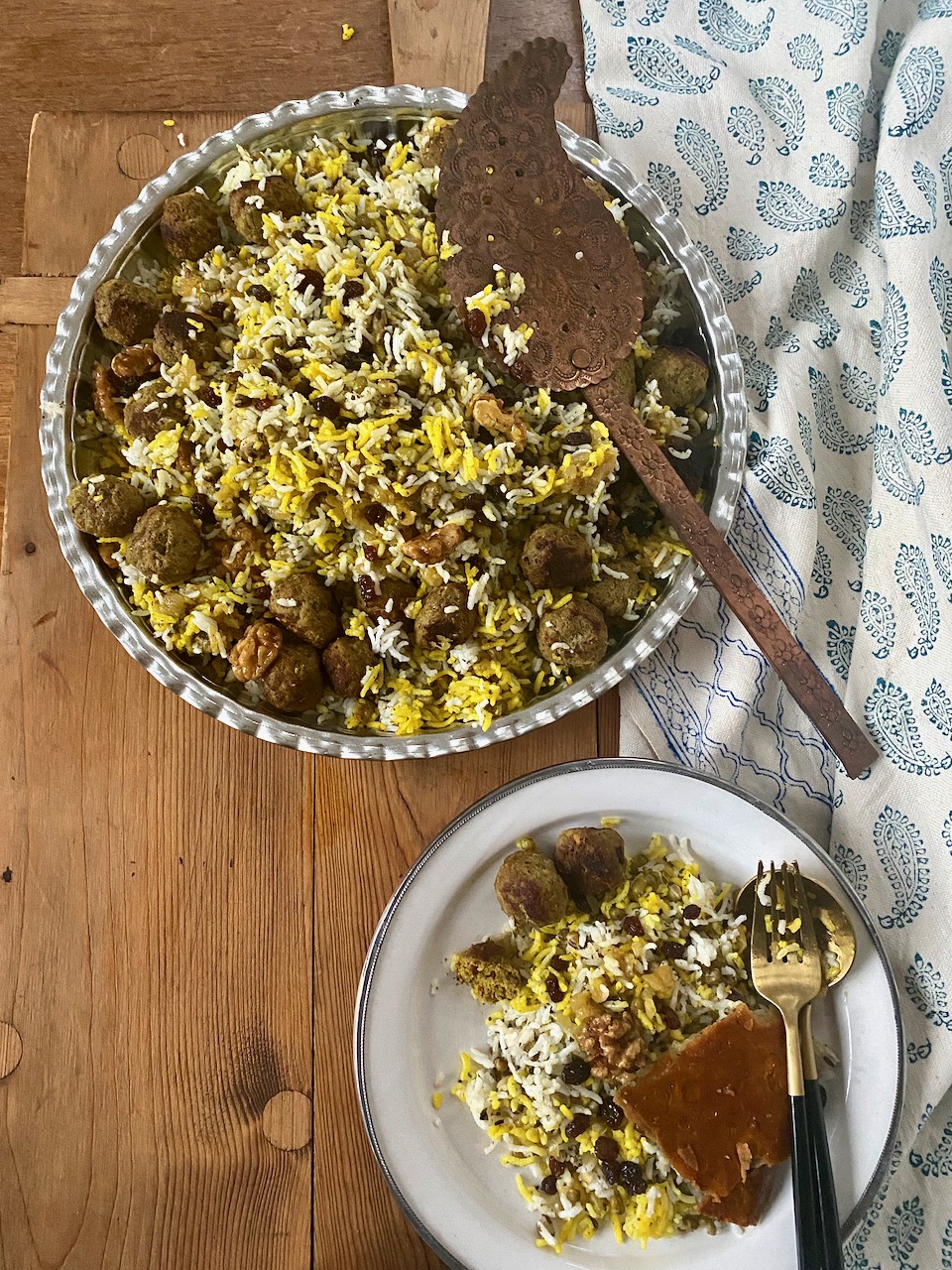 In a dish, spread some of the dill mung bean rice and apply alternating saffron dill mung bean rice, meatballs, fried onions, raisins, and walnuts, see photos.