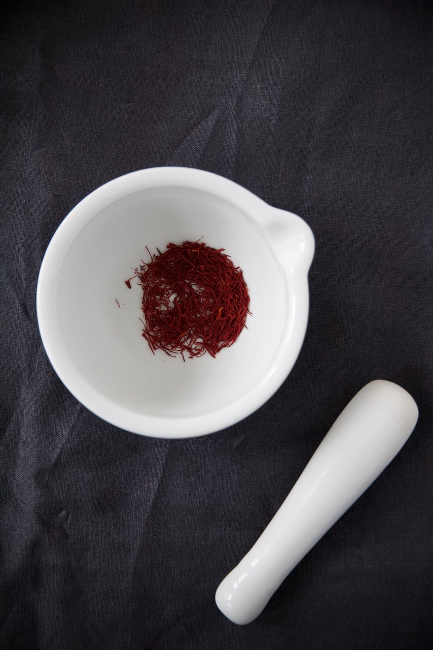 Grind the saffron threads in a mortar until fine. Pour over 50 ml of hot water and cover the mortar with a small plate to keep the aromas.