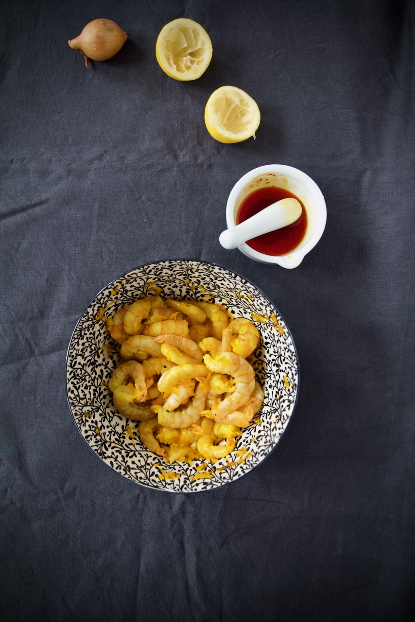 Clean the shrimp and remove the vein. Grate the onion and squeeze the lemon. Mix the shrimp with onion, lemon juice, use only 20 ml of the brewed saffron (keep the rest for later), plus salt and pepper. Cover and let marinate in the fridge for about 4–5 hours.