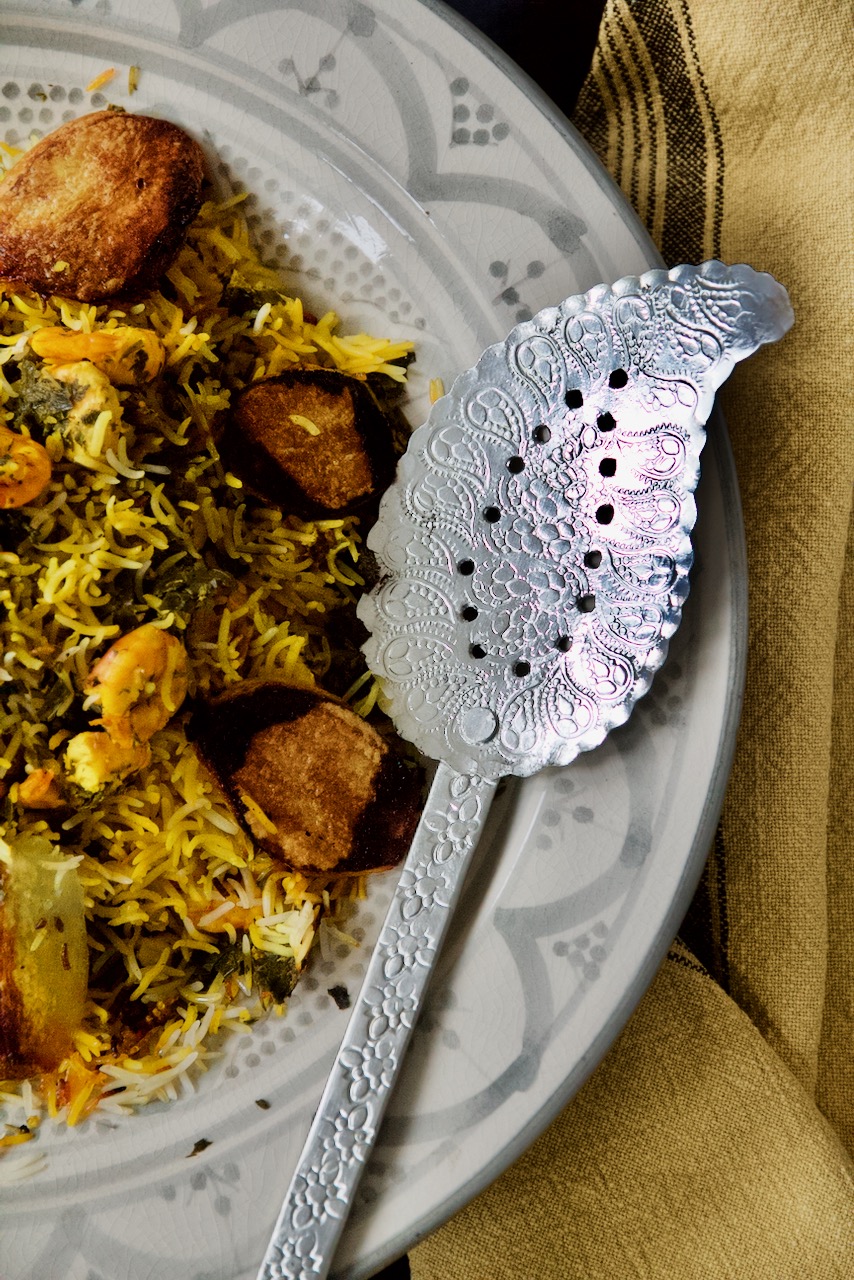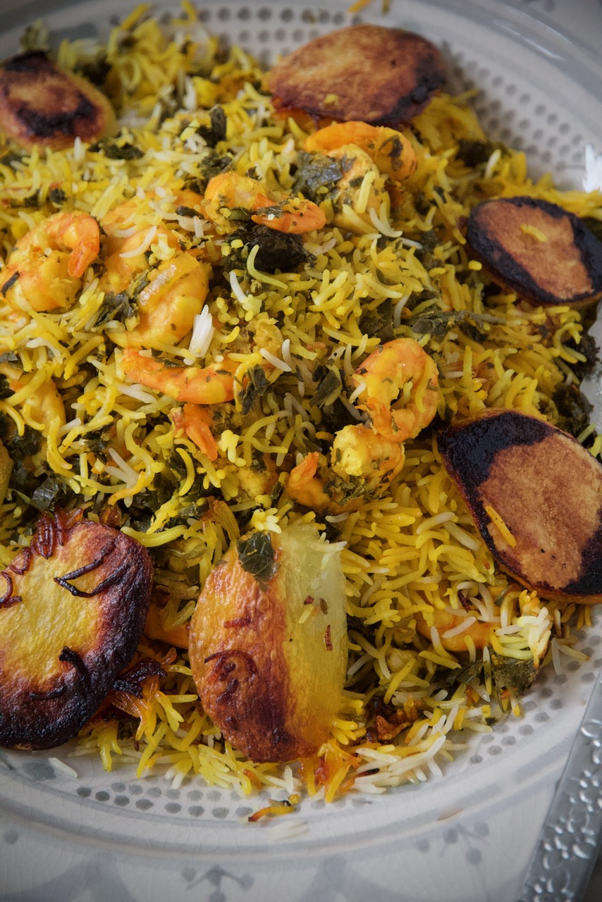 2. Place a large serving platter over the pot, hold it firmly with both hands, and quickly flip the pot upside down. If done in one confident move, the rice will come out as a beautiful golden dome with the shrimp, herbs, and fluffy basmati inside – and the crispy potato crust on the outside.
