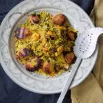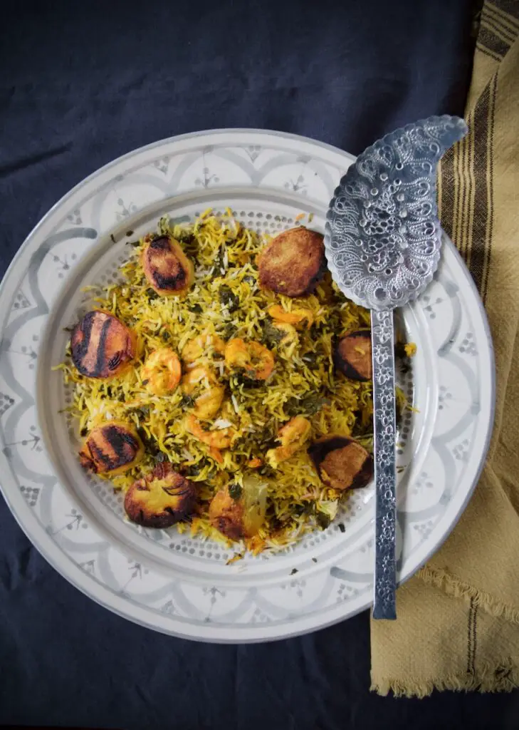 Meygoo Polo, also known as Havari Polo, is a true classic of southern Persian cooking and, for me, one of the most delicious rice dishes in Iran. Firm, juicy shrimp, fresh herbs, and warm oriental spices are layered between fragrant basmati rice – creating a dish that is both comforting and full of exotic flavors.