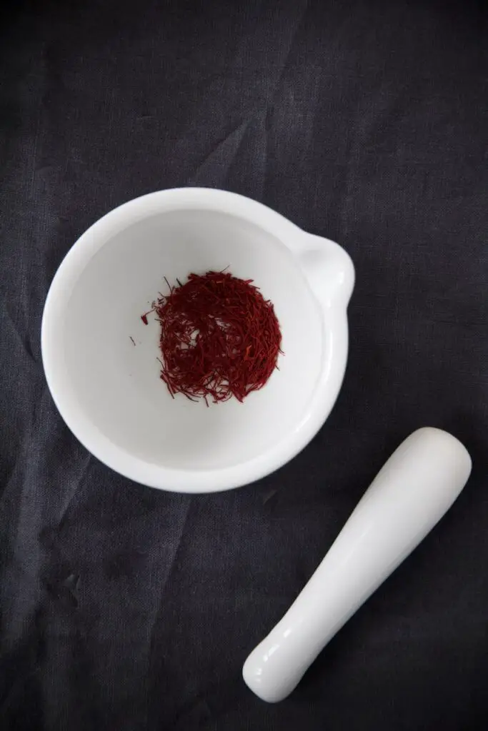 1. Grind the saffron threads in a mortar until fine.