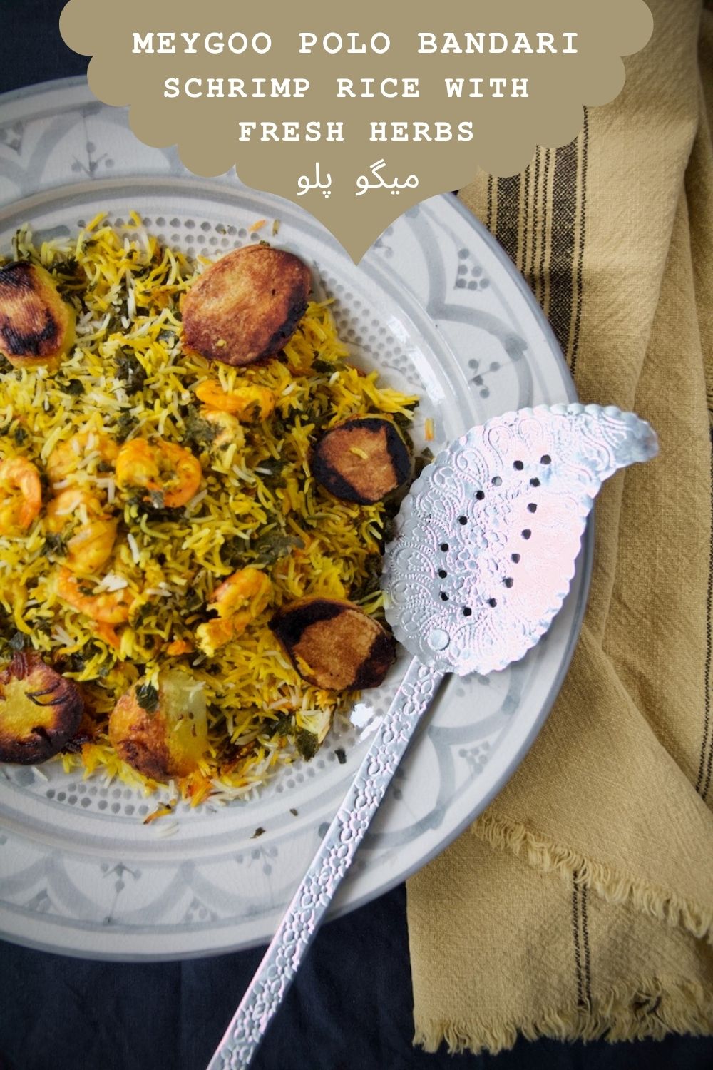 Meygoo Polo Bandari – Shrimp Rice with Fresh Herbs میگو پلو brings together all the flavors of Bandar Abbas, Bushehr, and Khuzestan in the south of Persia. In Farsi, Meygoo means shrimp and Polo means rice – so quite simply, it’s shrimp with rice.