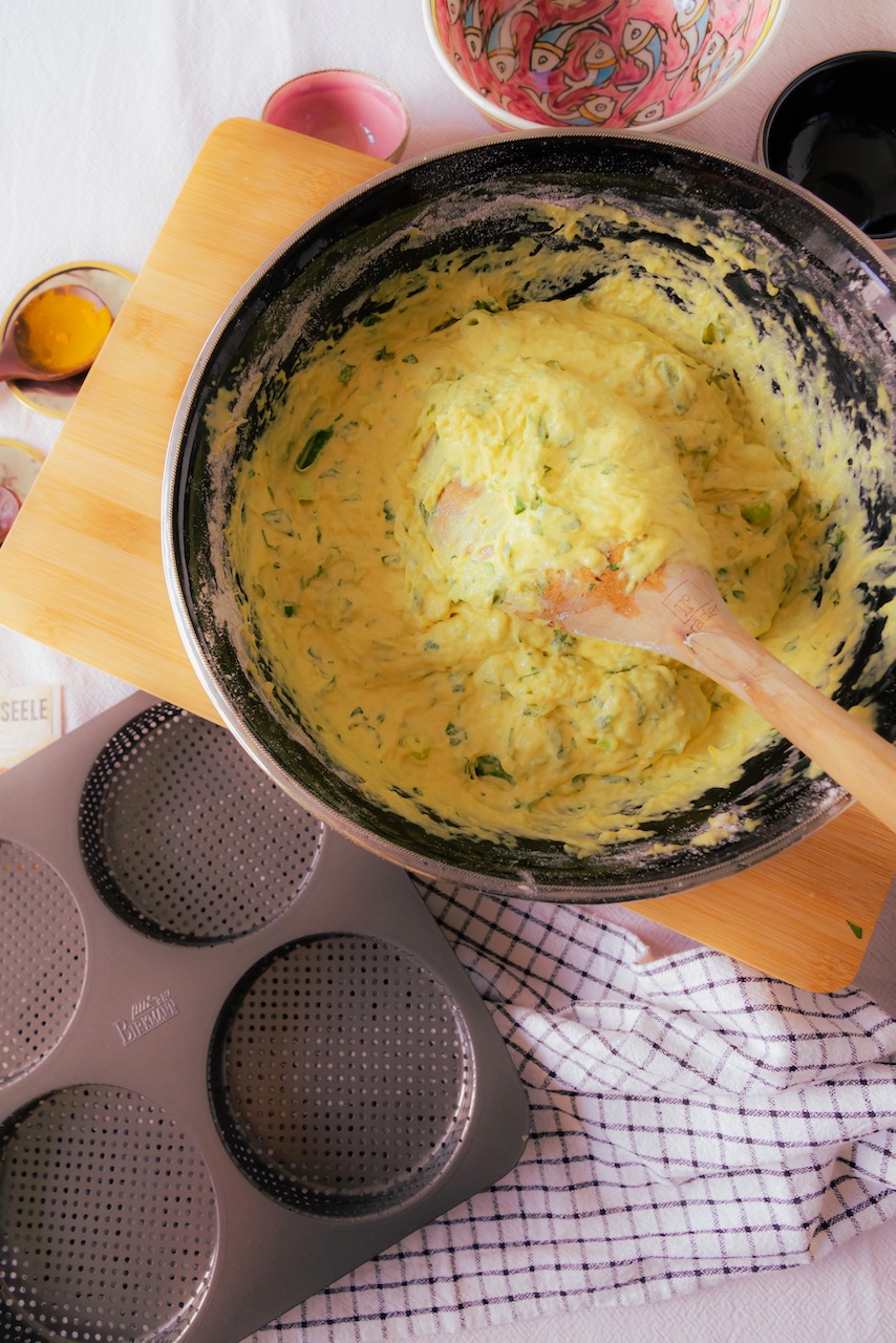 Add the milk, olive oil, finely chopped spring onions, chopped flat-leaf parsley, salt, turmeric, and type 550 wheat flour to the bowl with the risen yeast. Mix well with a wooden spoon until the dough comes together. The dough is very sticky as it is high in liquid.