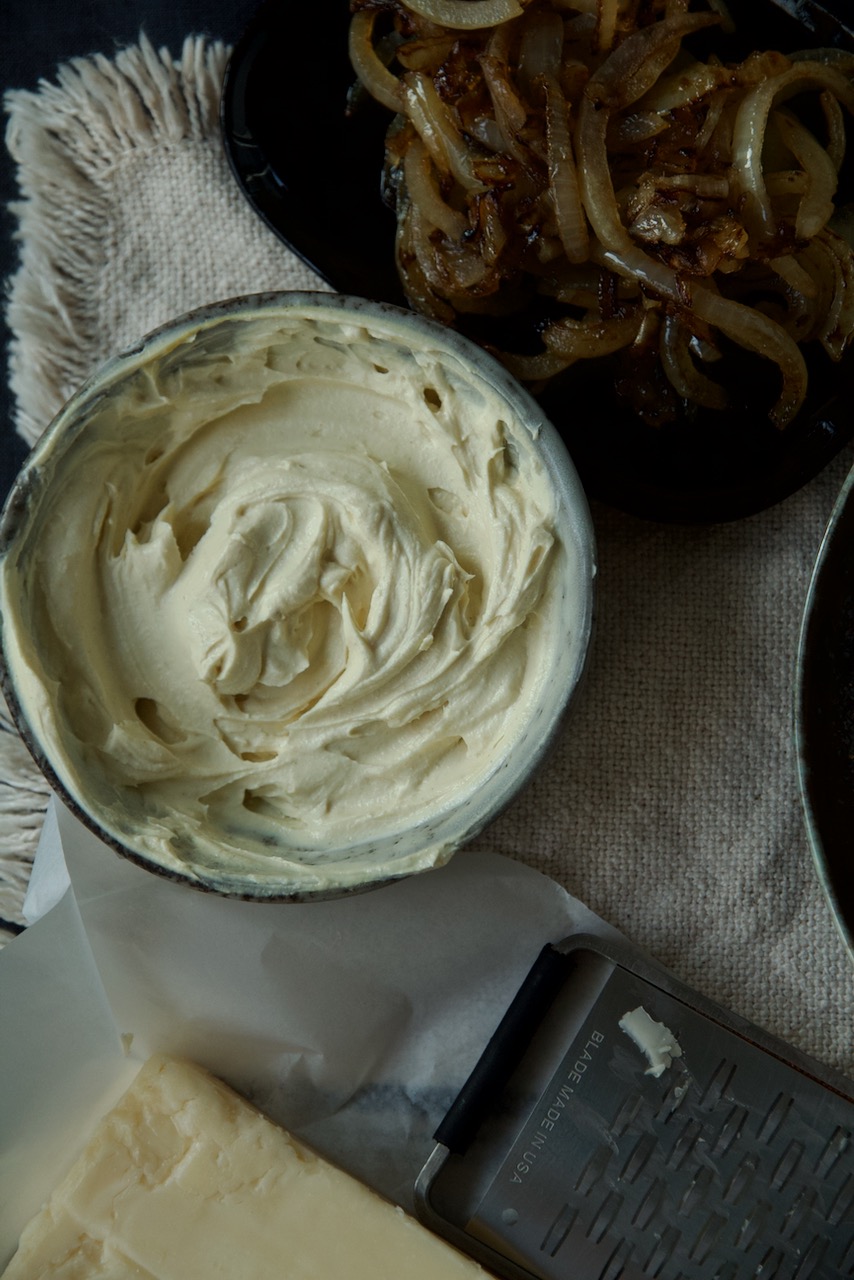 In the meantime, mix the cream cheese with the mustard and cut the rye bread into slices.